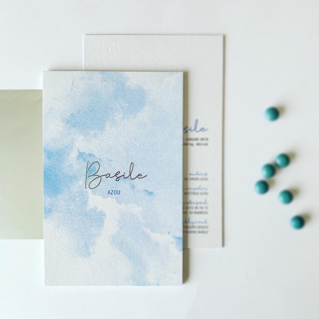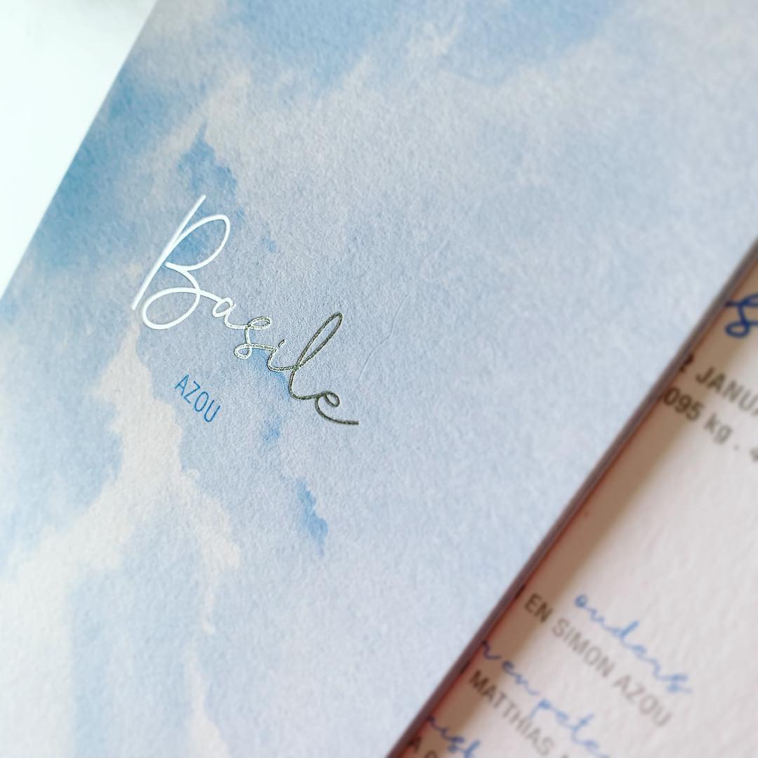 Lichtblauw en zilveren foliedruk voor Basile.