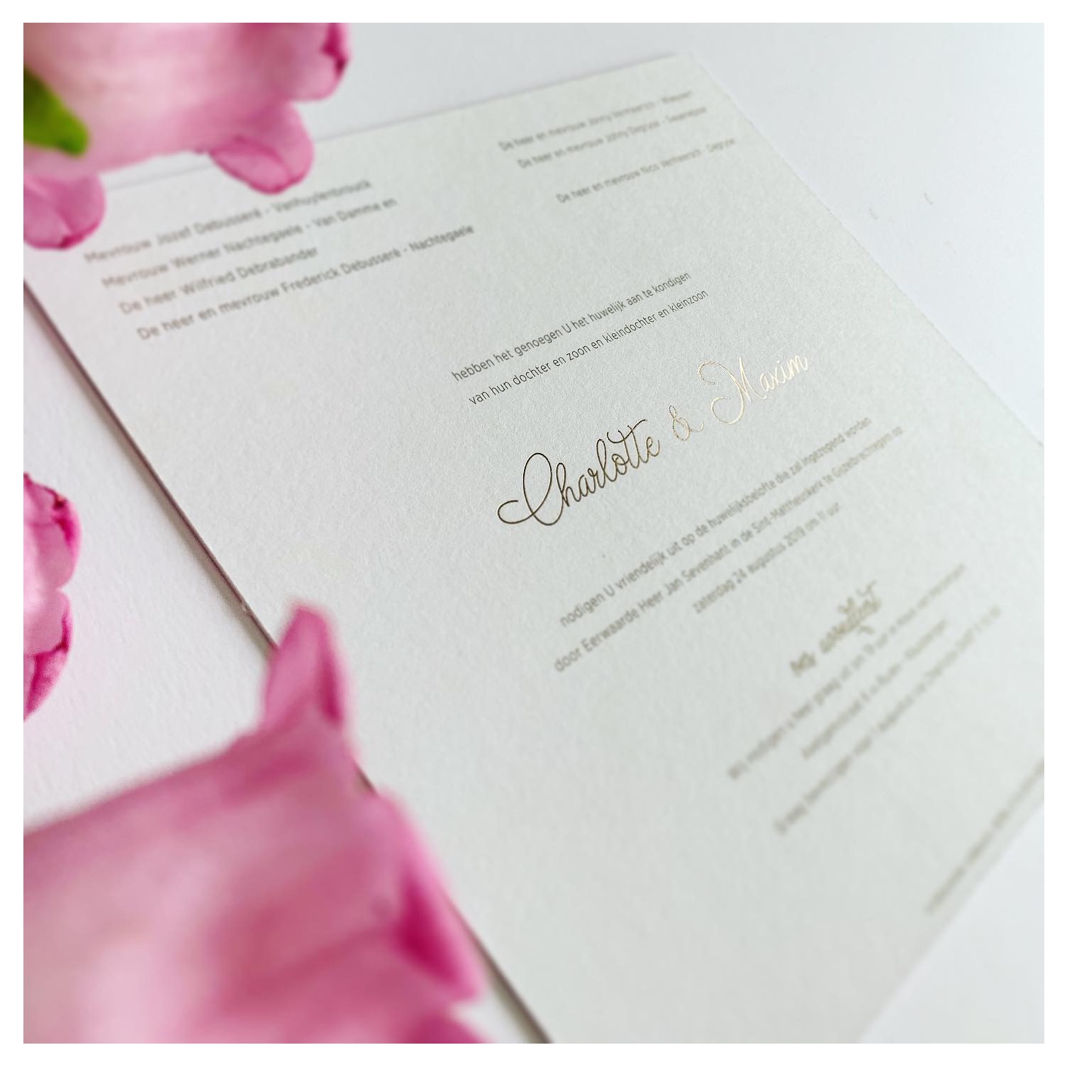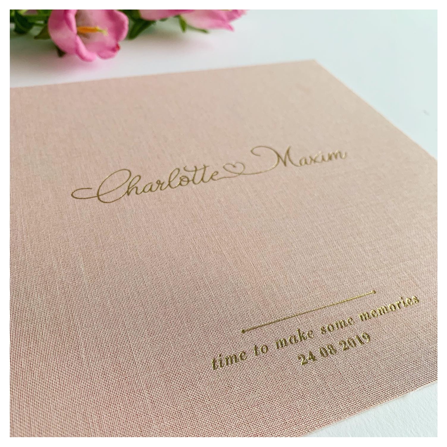 Charlotte & Maxim – huwelijksuitnodiging op roze linnen afgewerkt met een gouden foliedruk