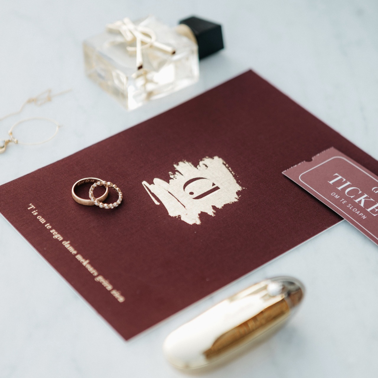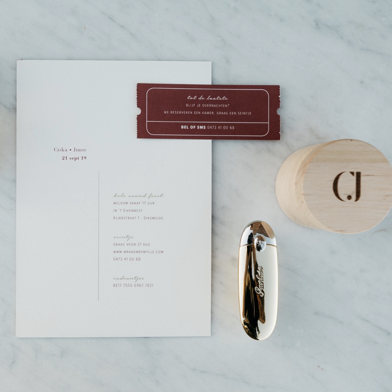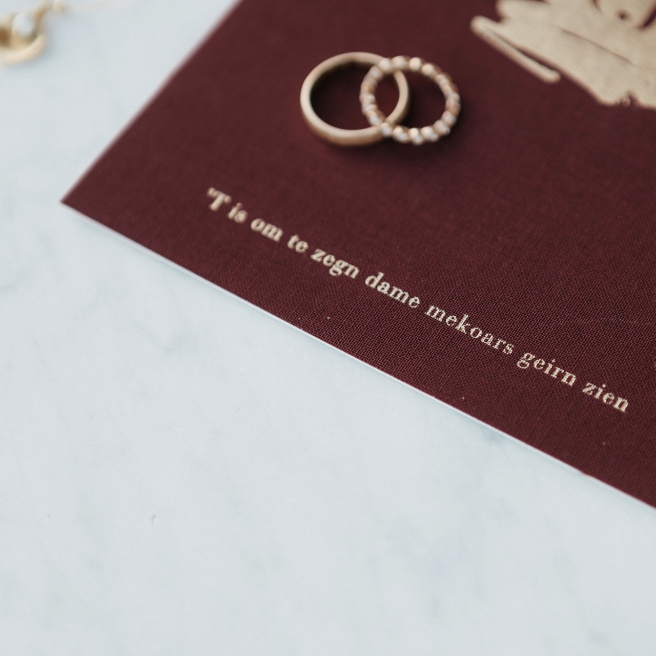 Trouwkaart voor Ciska & Jimte gedrukt op bordeaux linnen met gouden foliedruk. Modern, strak trouwlogo van hun initialen. Drukwerk van begin tot eind van hun prachtige dag.