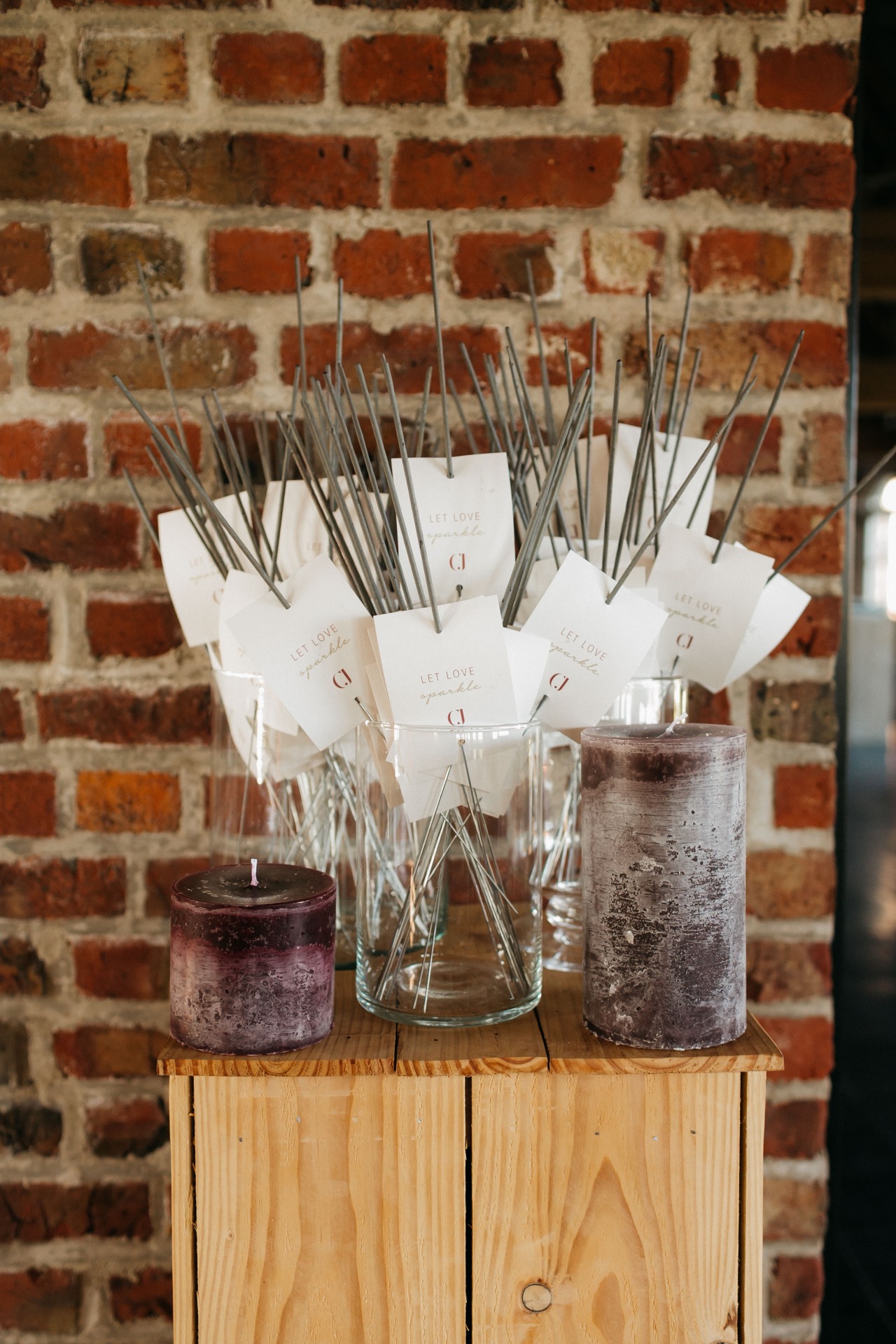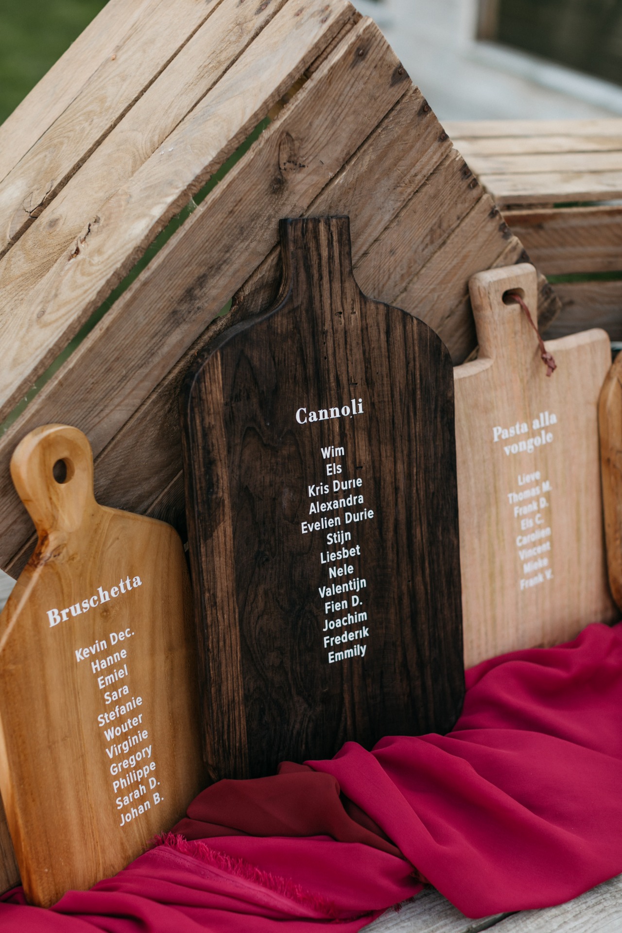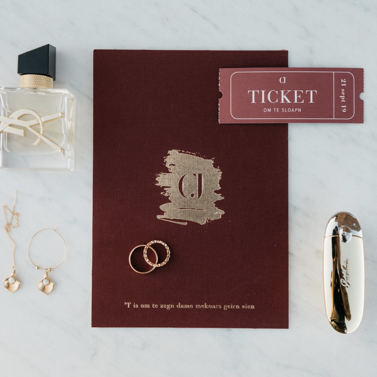 Trouwkaart voor Ciska & Jimte gedrukt op bordeaux linnen met gouden foliedruk. Modern, strak trouwlogo van hun initialen. Drukwerk van begin tot eind van hun prachtige dag.