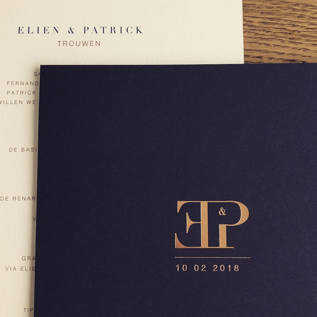 Donkerblauwe trouwuitnodiging voor Eline & Patrick, afgewerkt met roségouden folie.