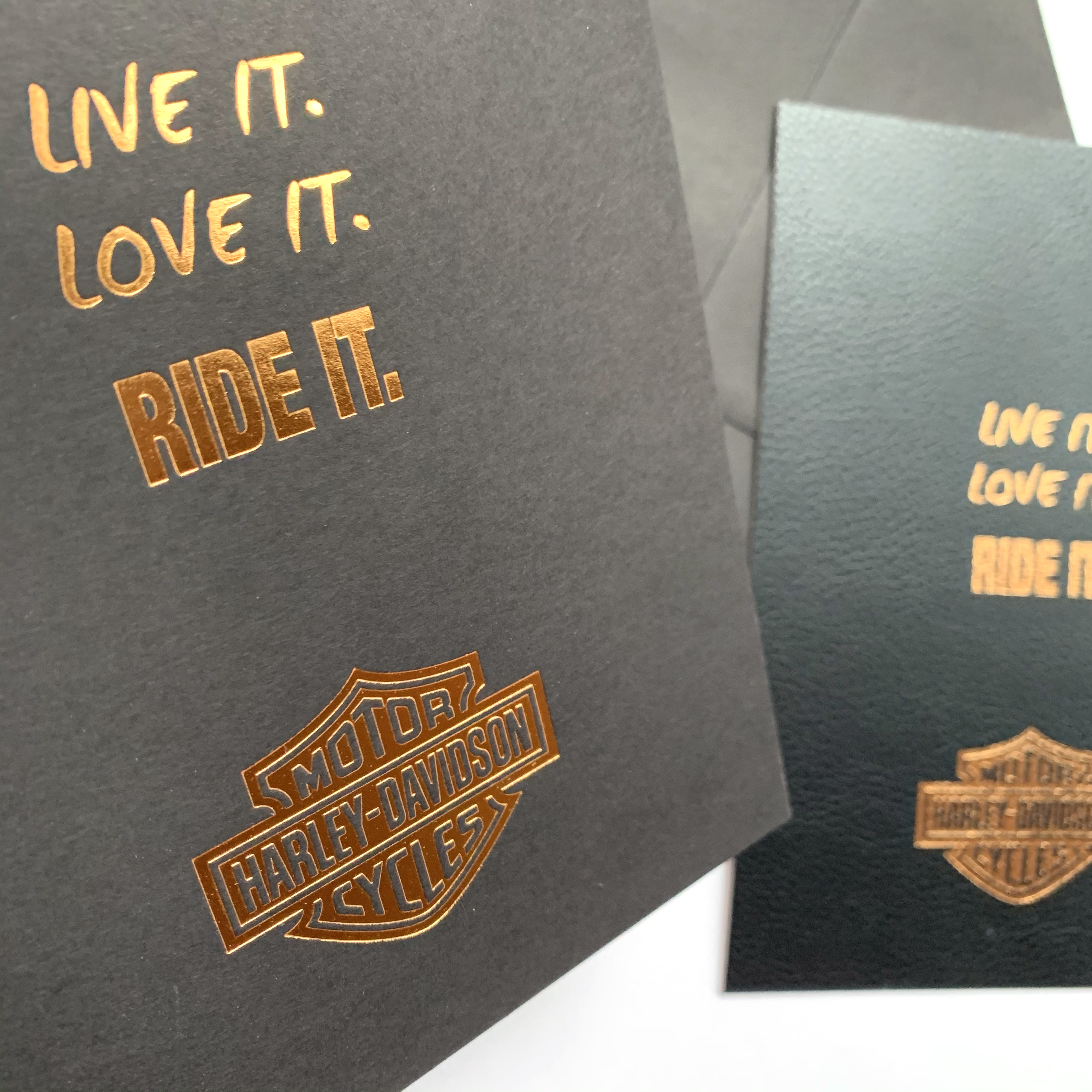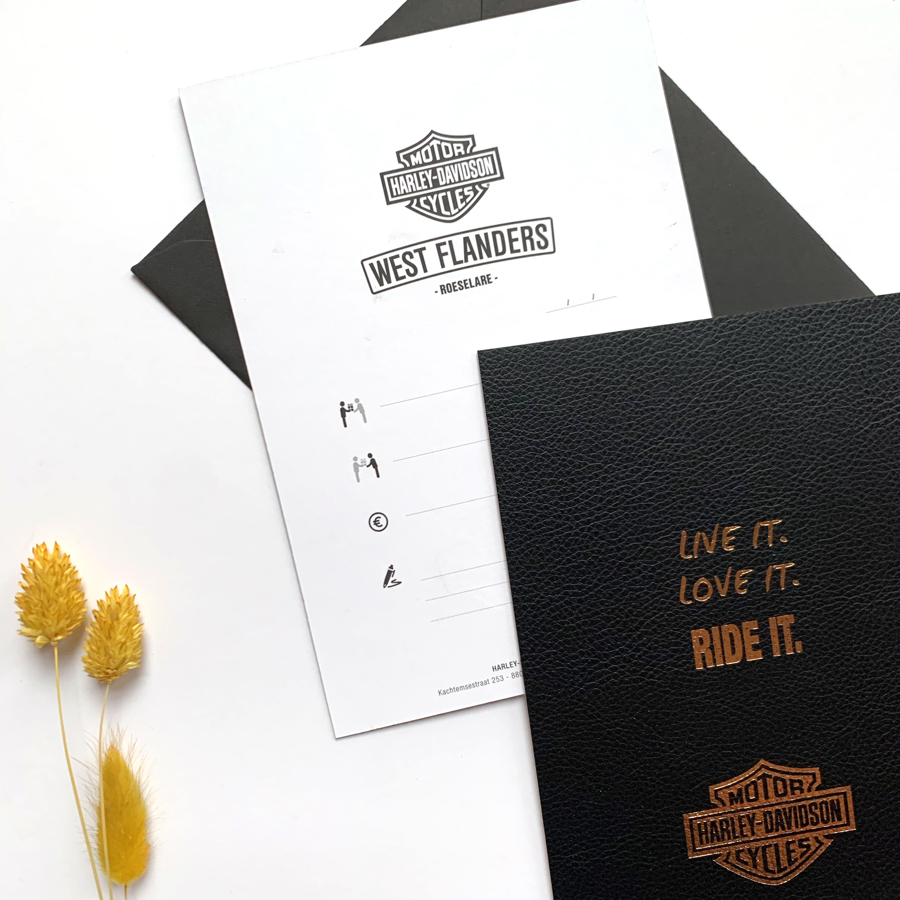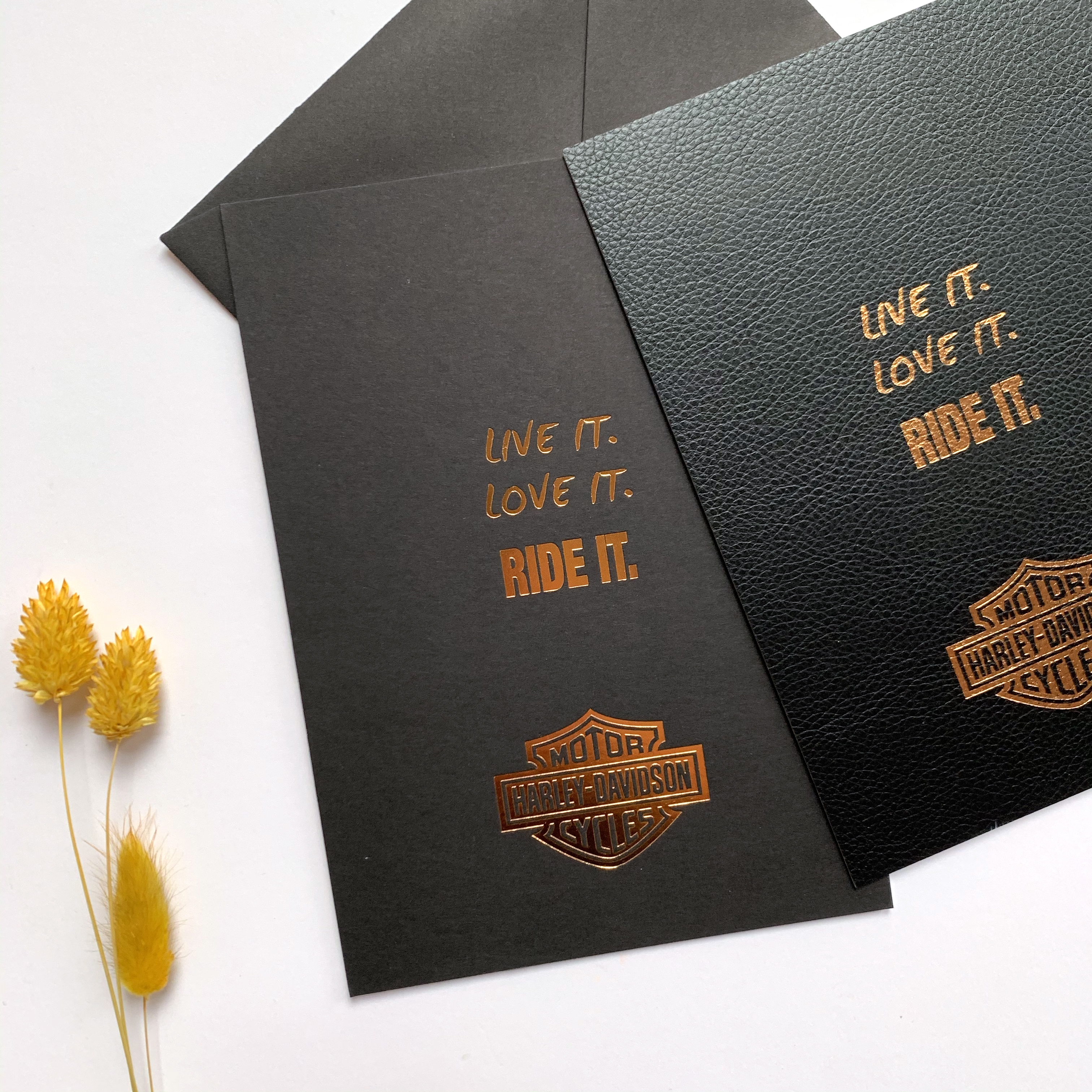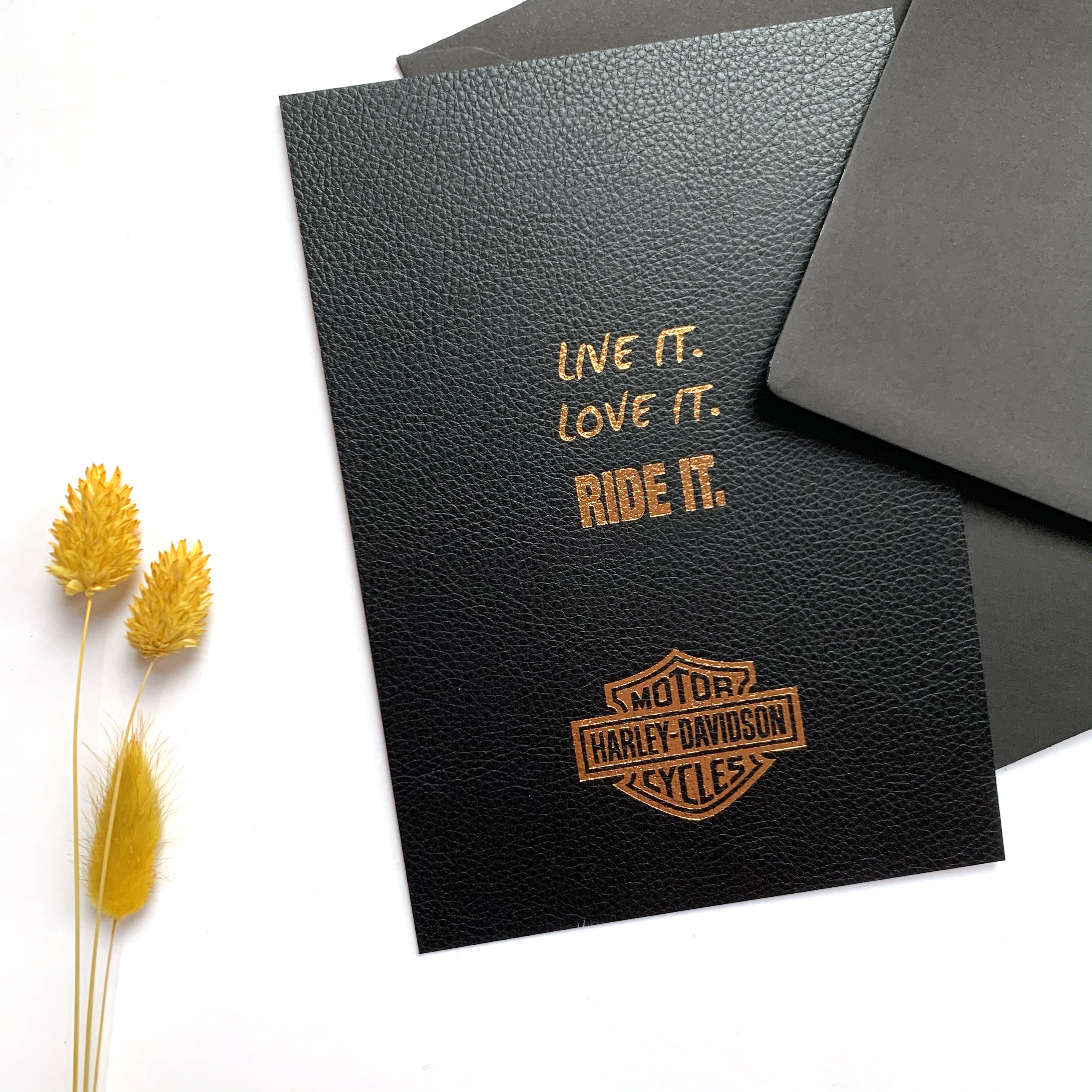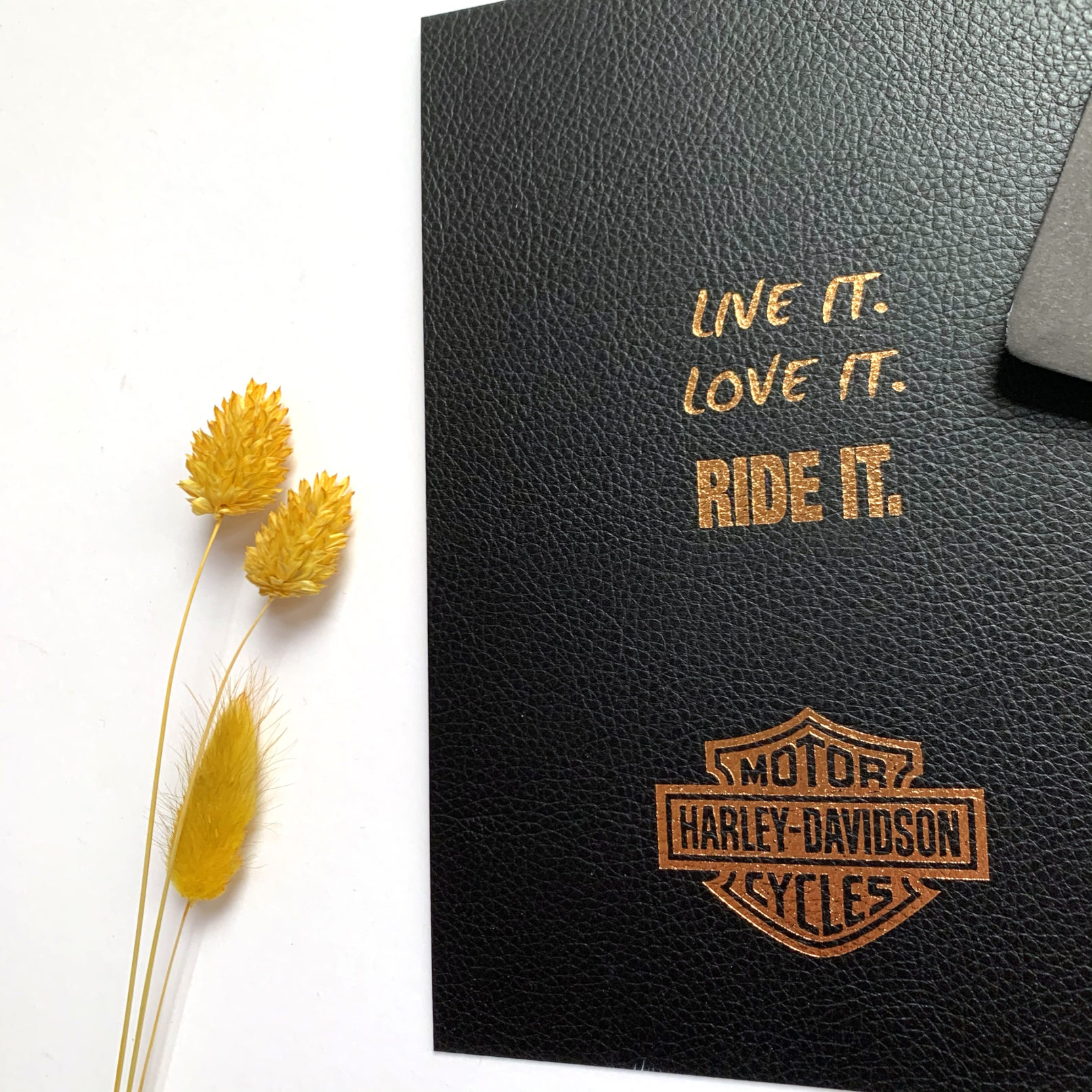 Cadeaubonnen voor Harley Davidson, lederen kaart met koperen foliedruk