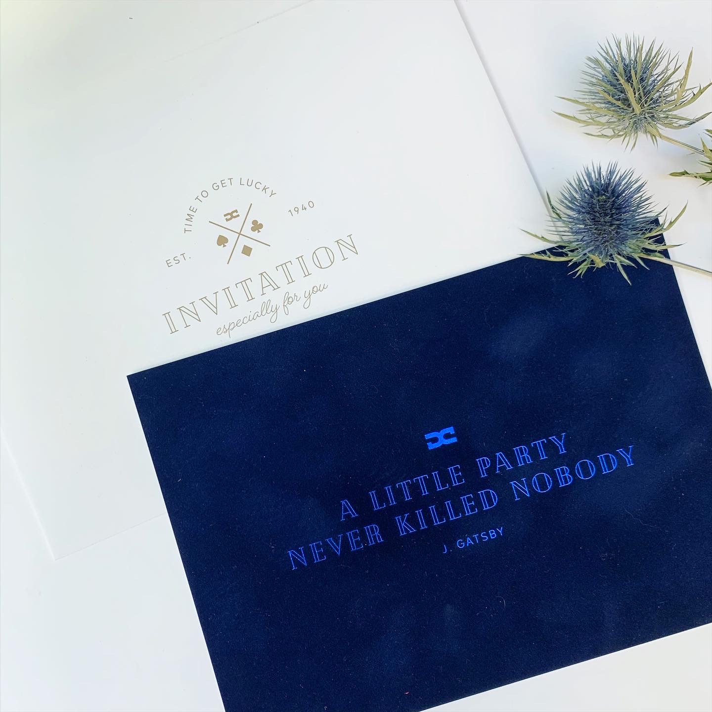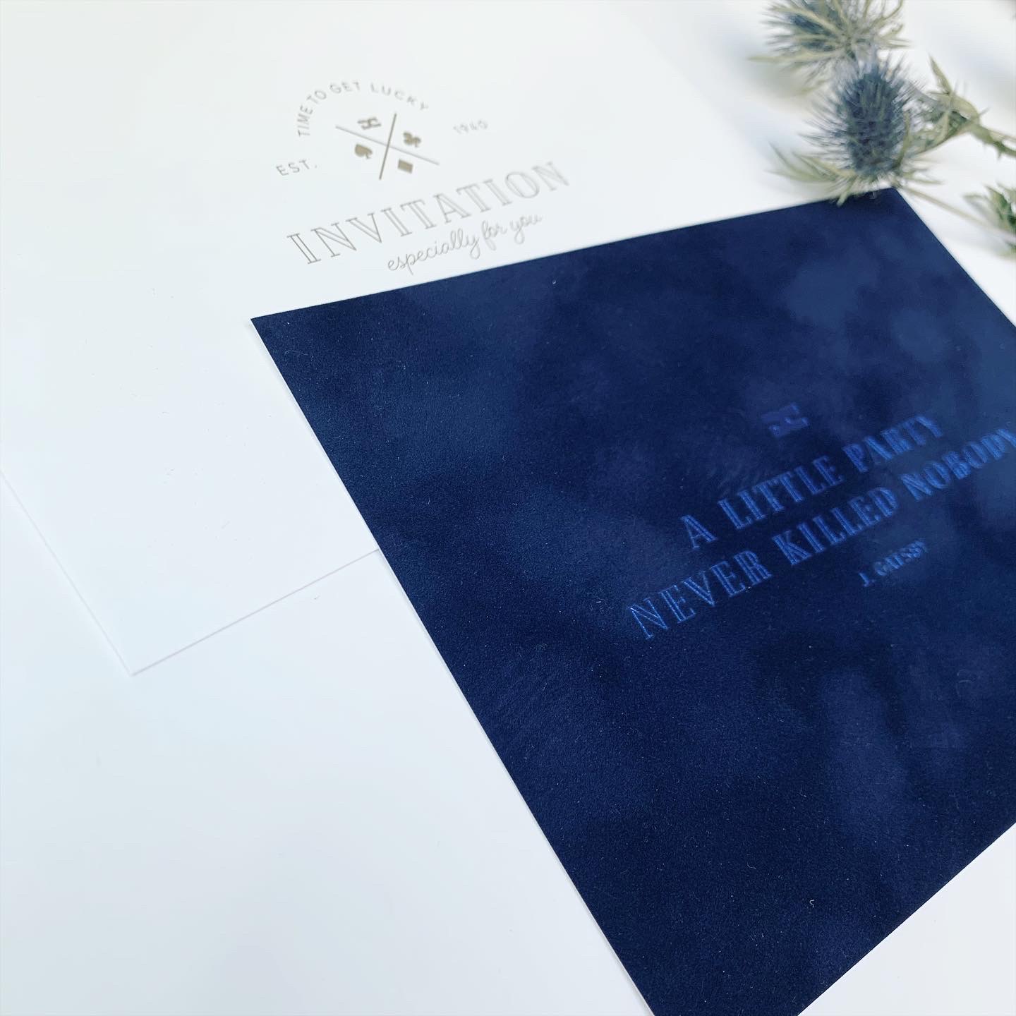 Uitnodiging voor personeelsfeest van accountancy Decostere. Blauw fluweel met blauwe foliedruk
