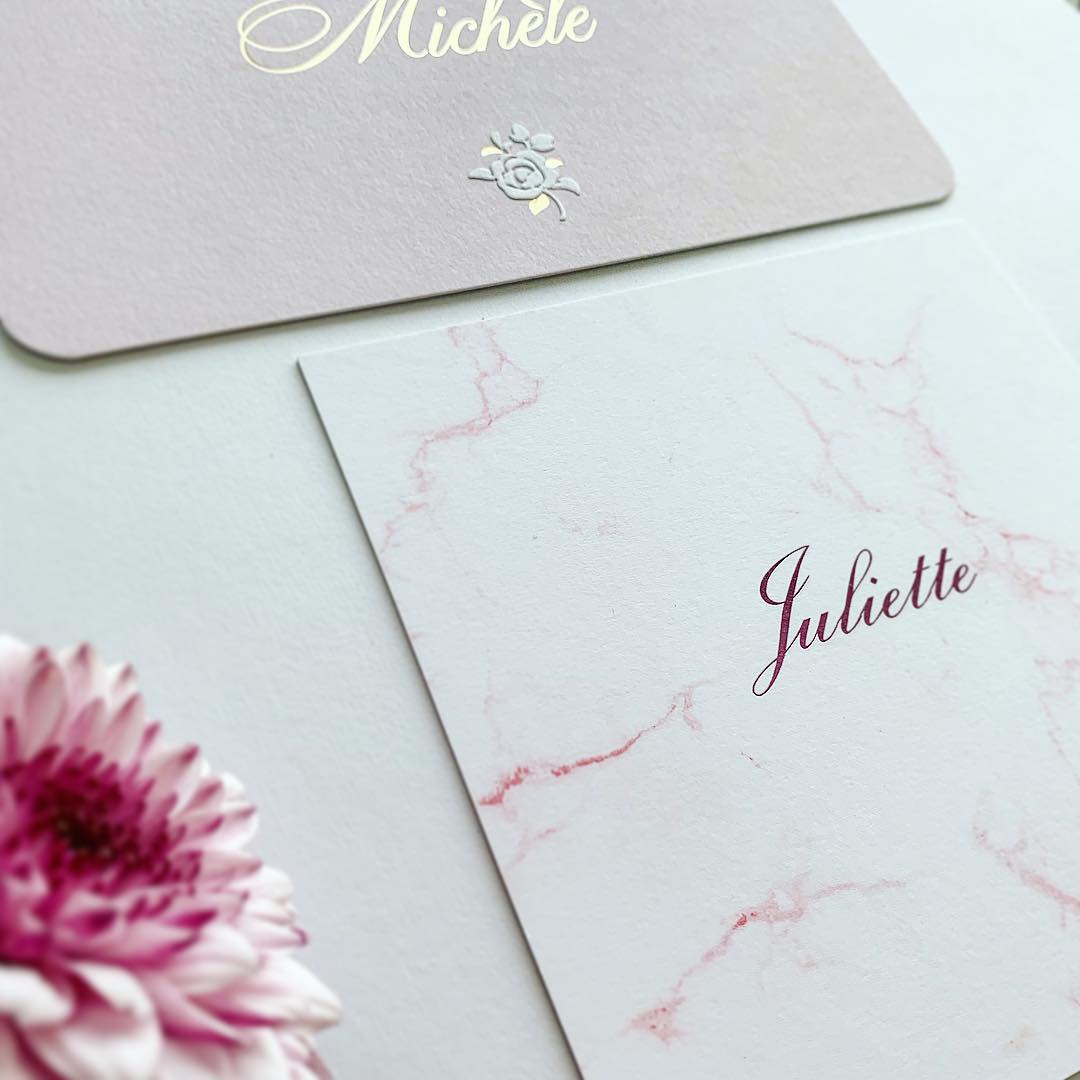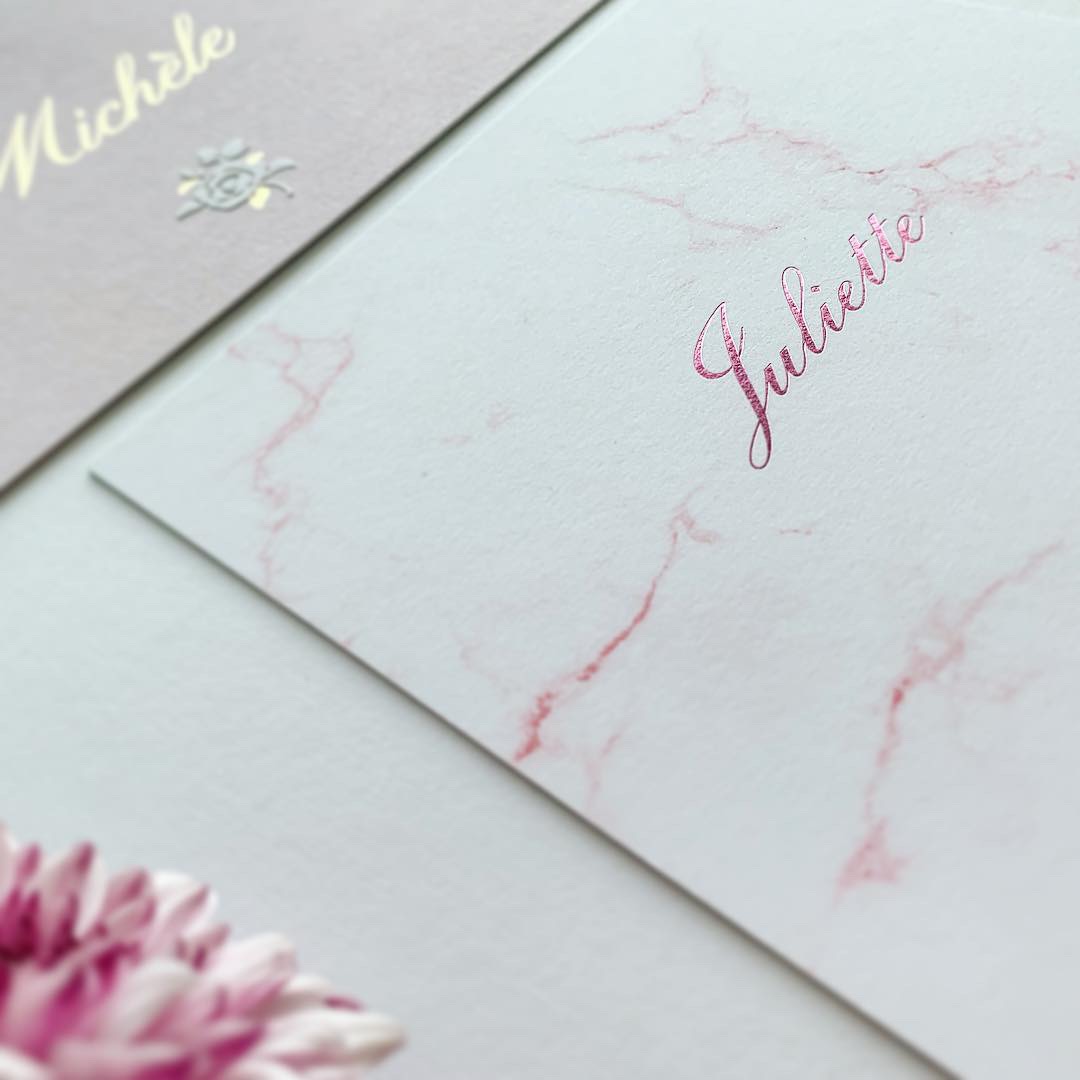 Foliedruk op roze marmer voor Juliette.