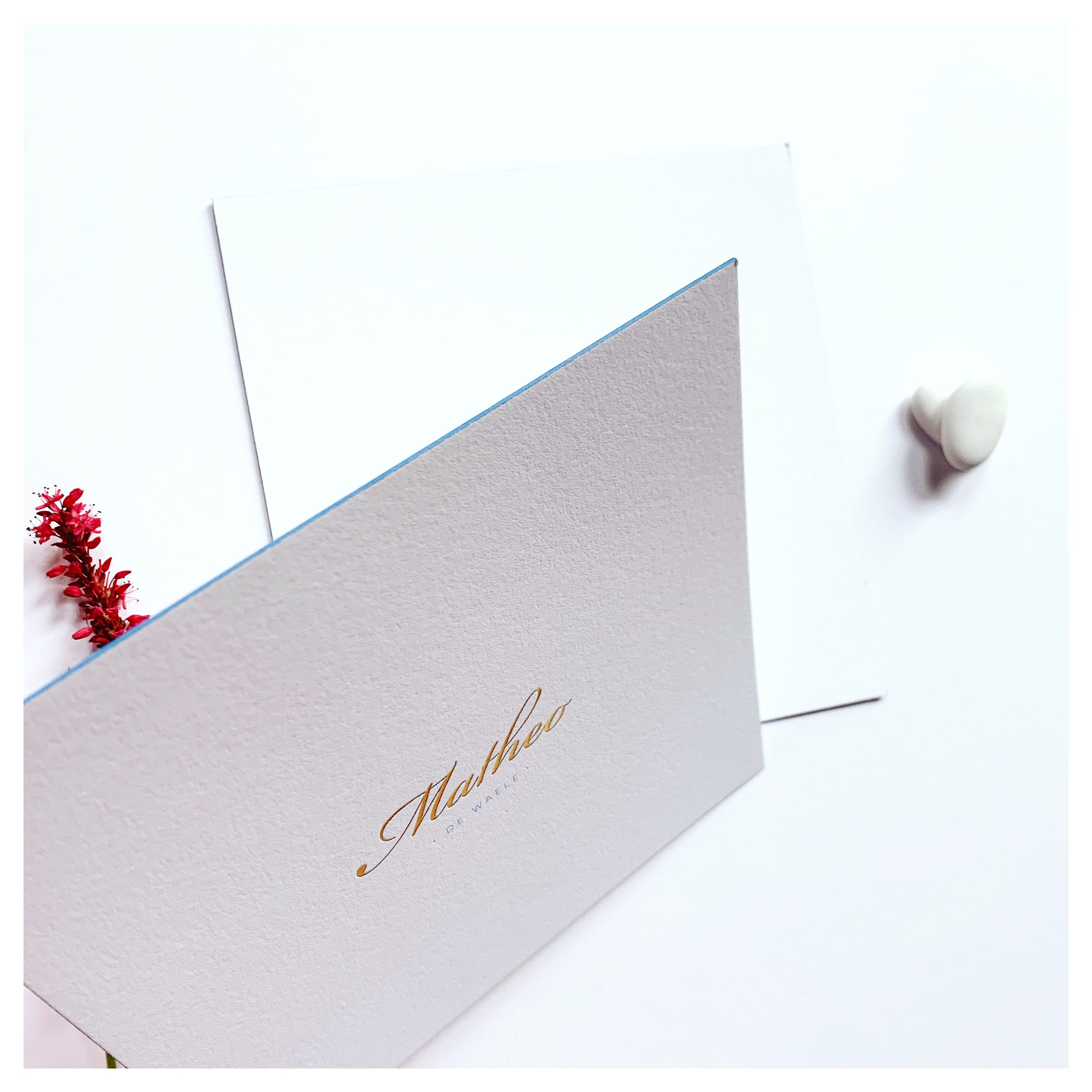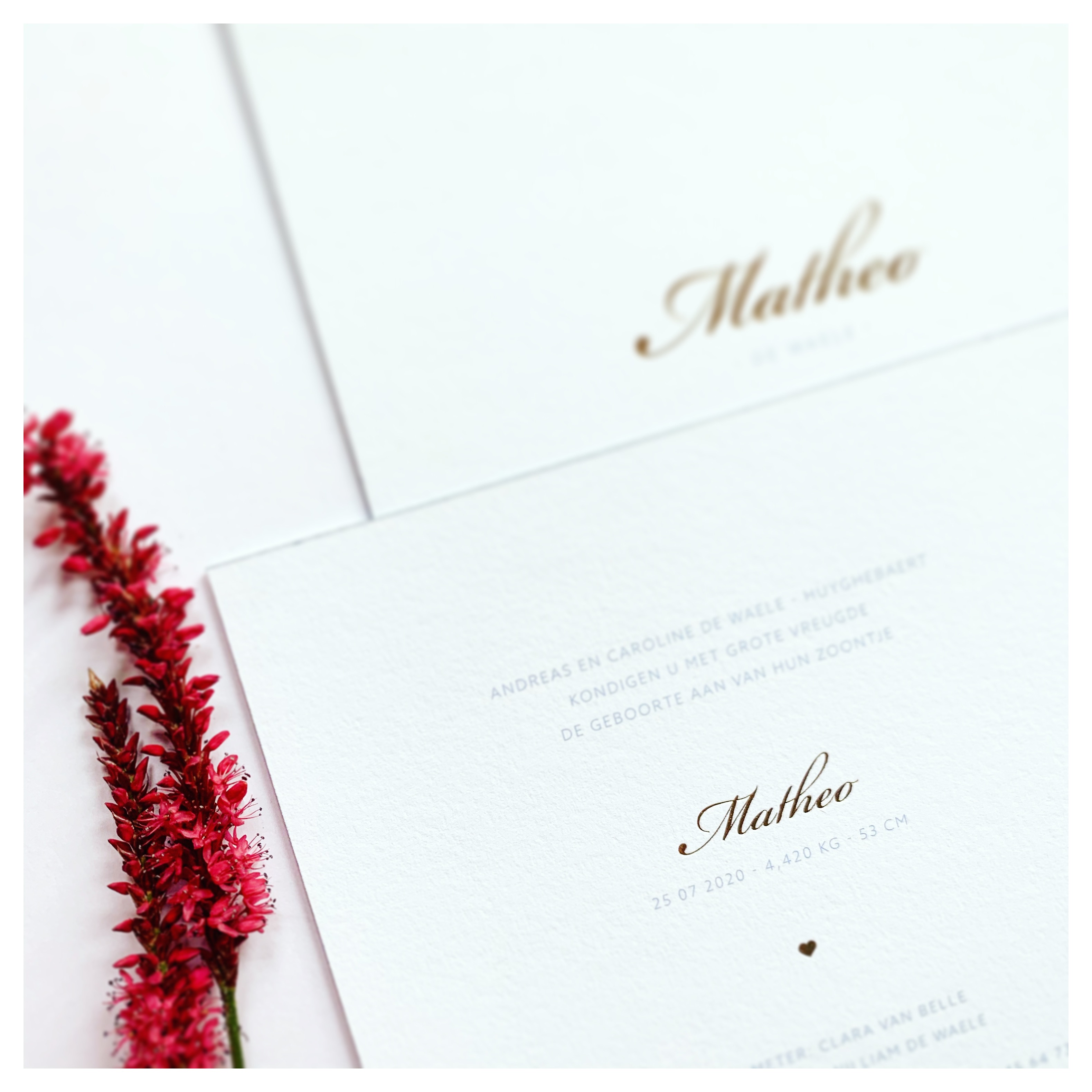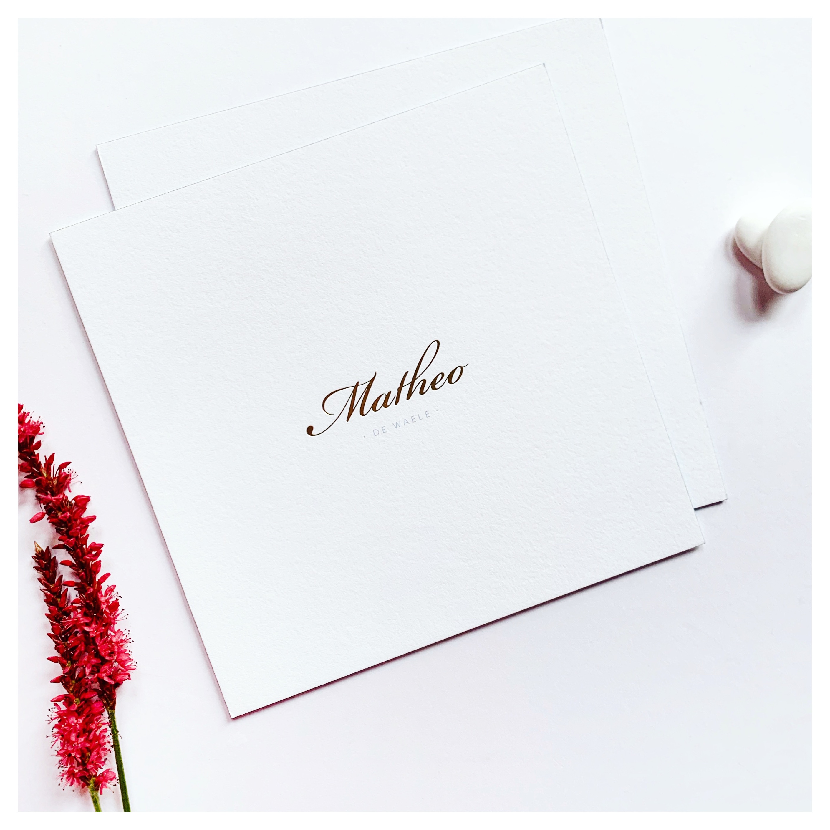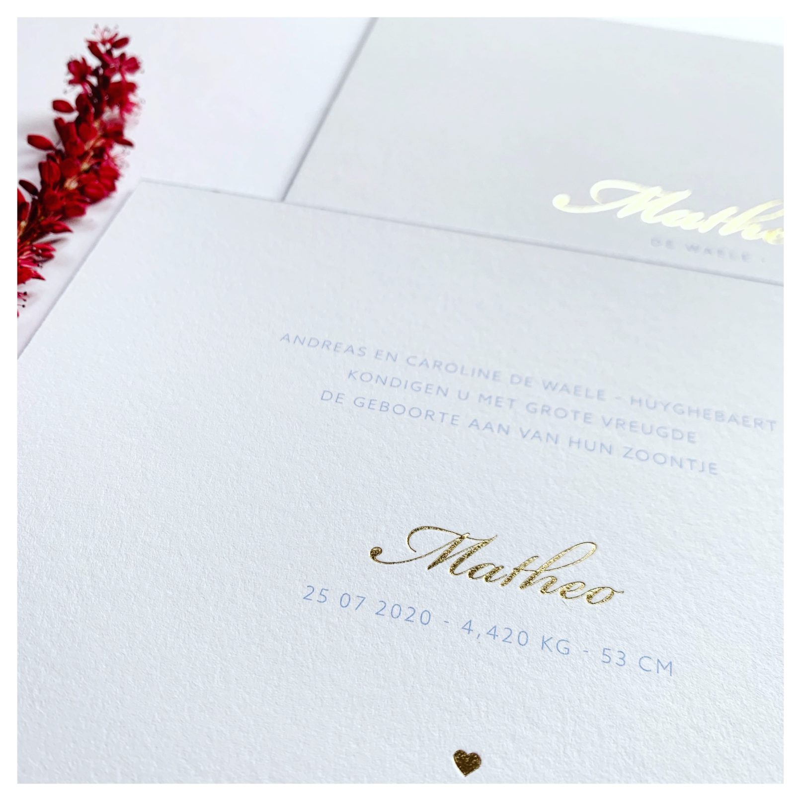Wit kaartje met gouden foliedruk voor Matheo