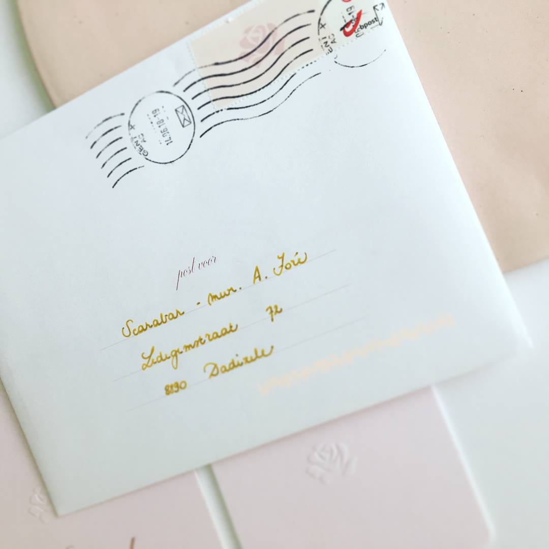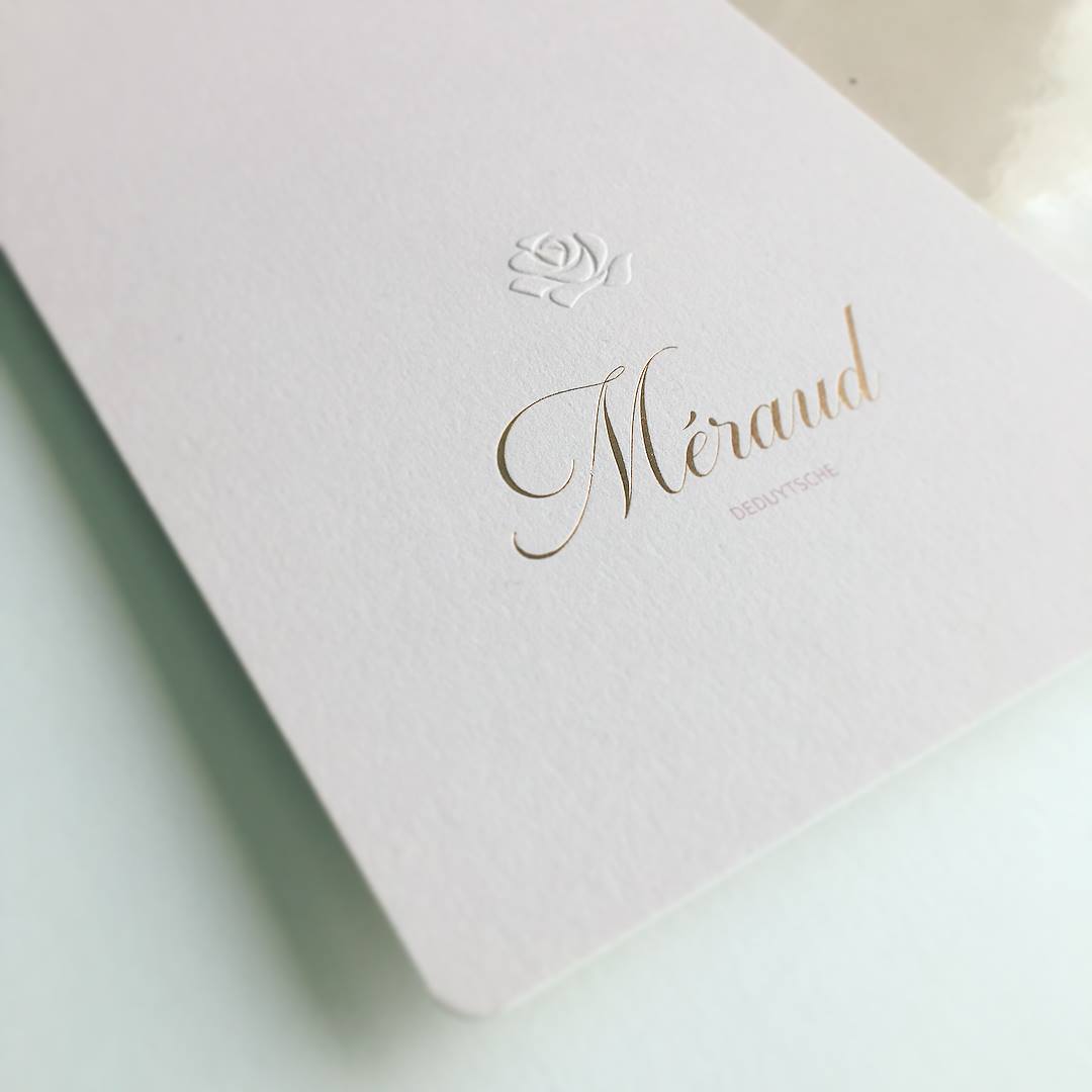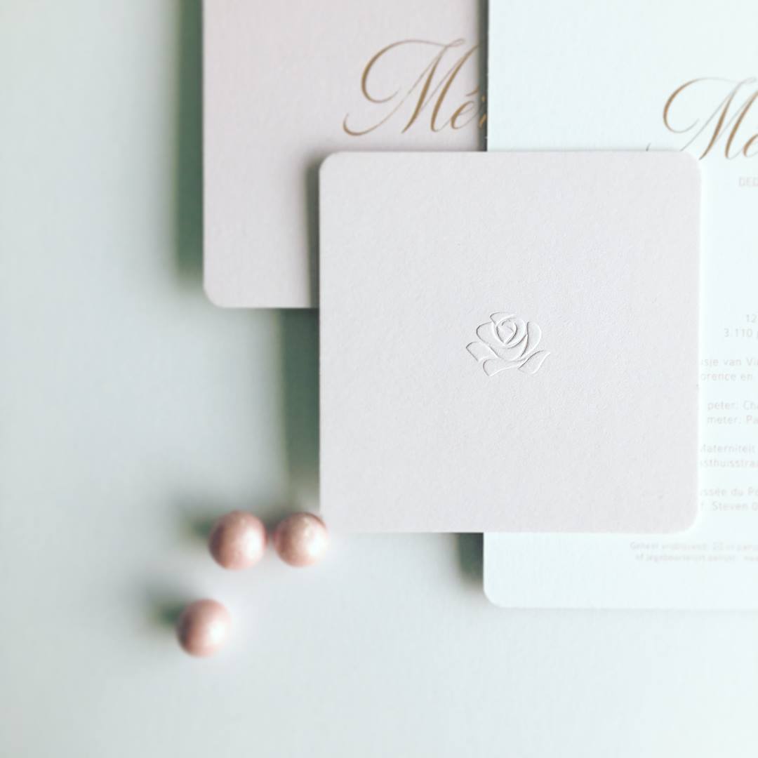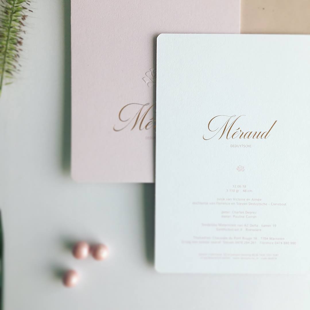 Geboortekaart Méraud met blinddruk en roségouden foliedruk.