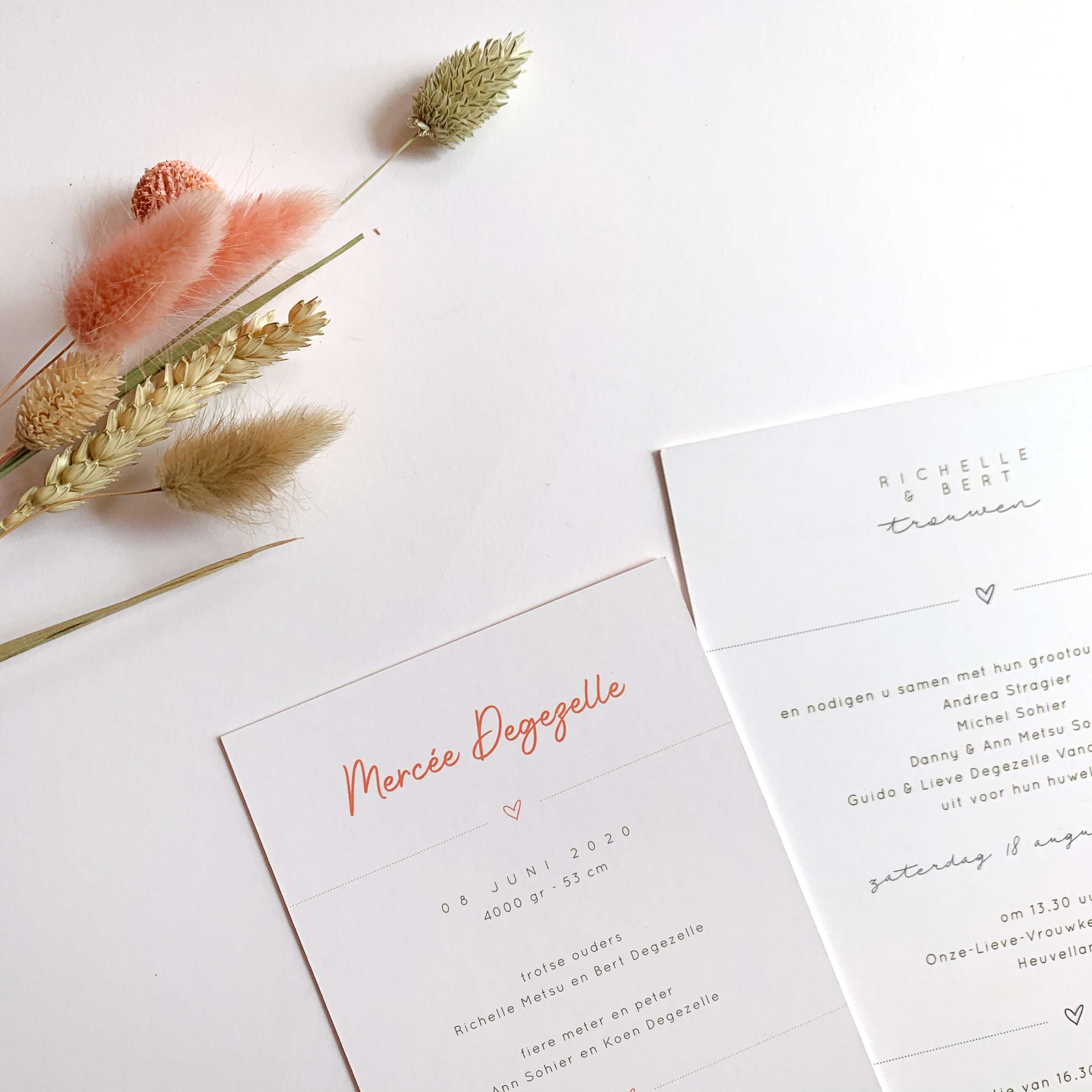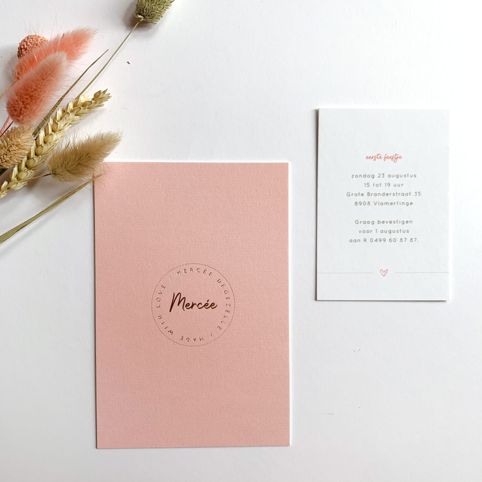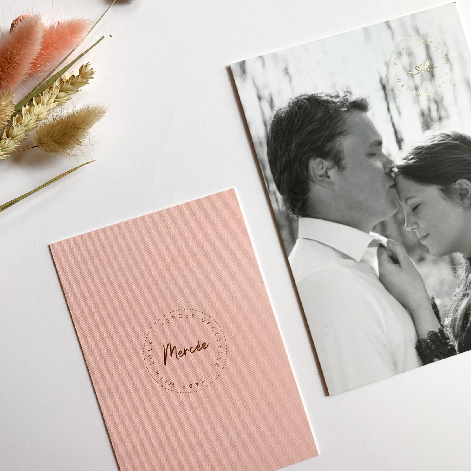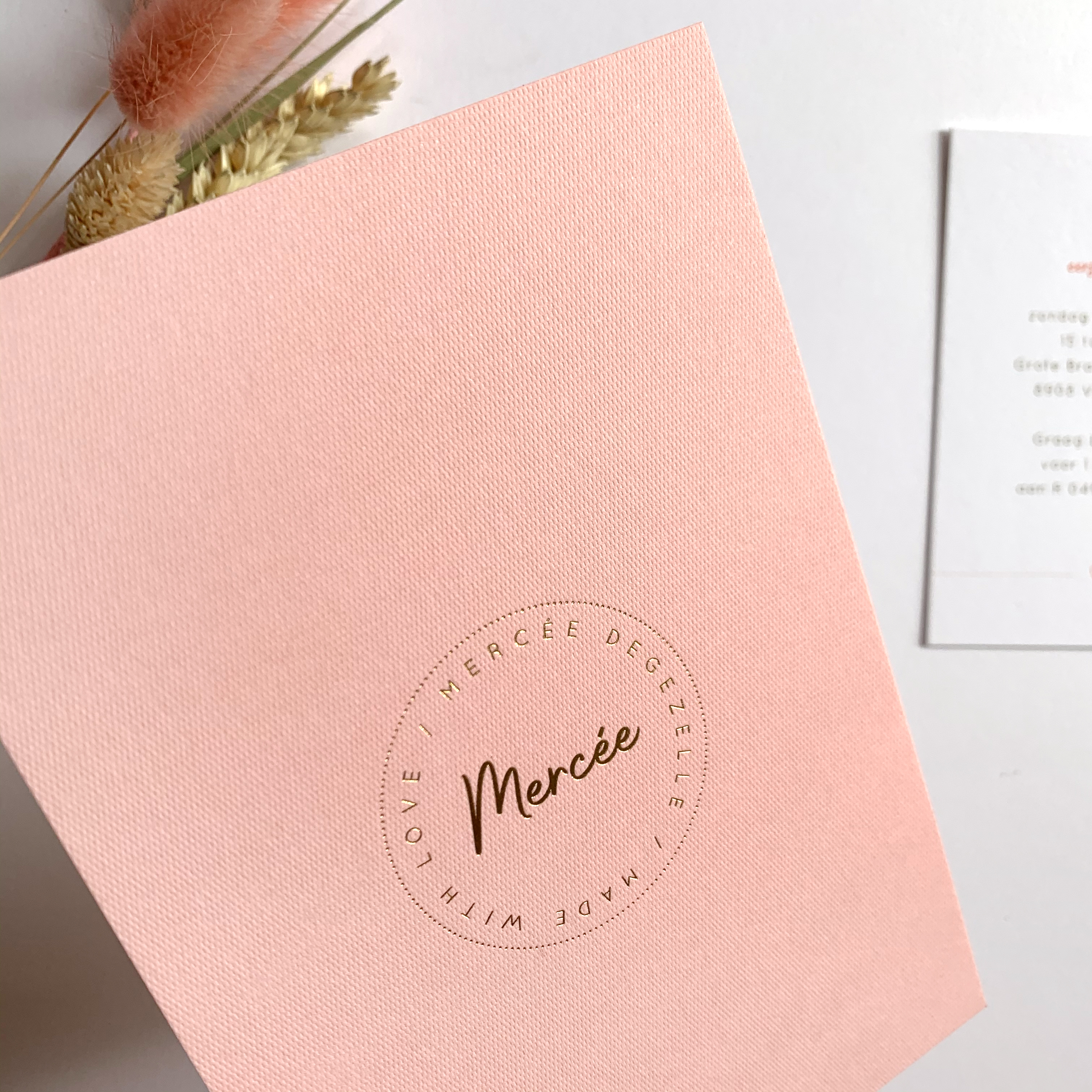 Gestructureerd papier met gouden foliedruk voor het geboortekaartje van Mercée. Subtiele knipoog naar het ontwerp van de huwelijkskaart van haar ouders.