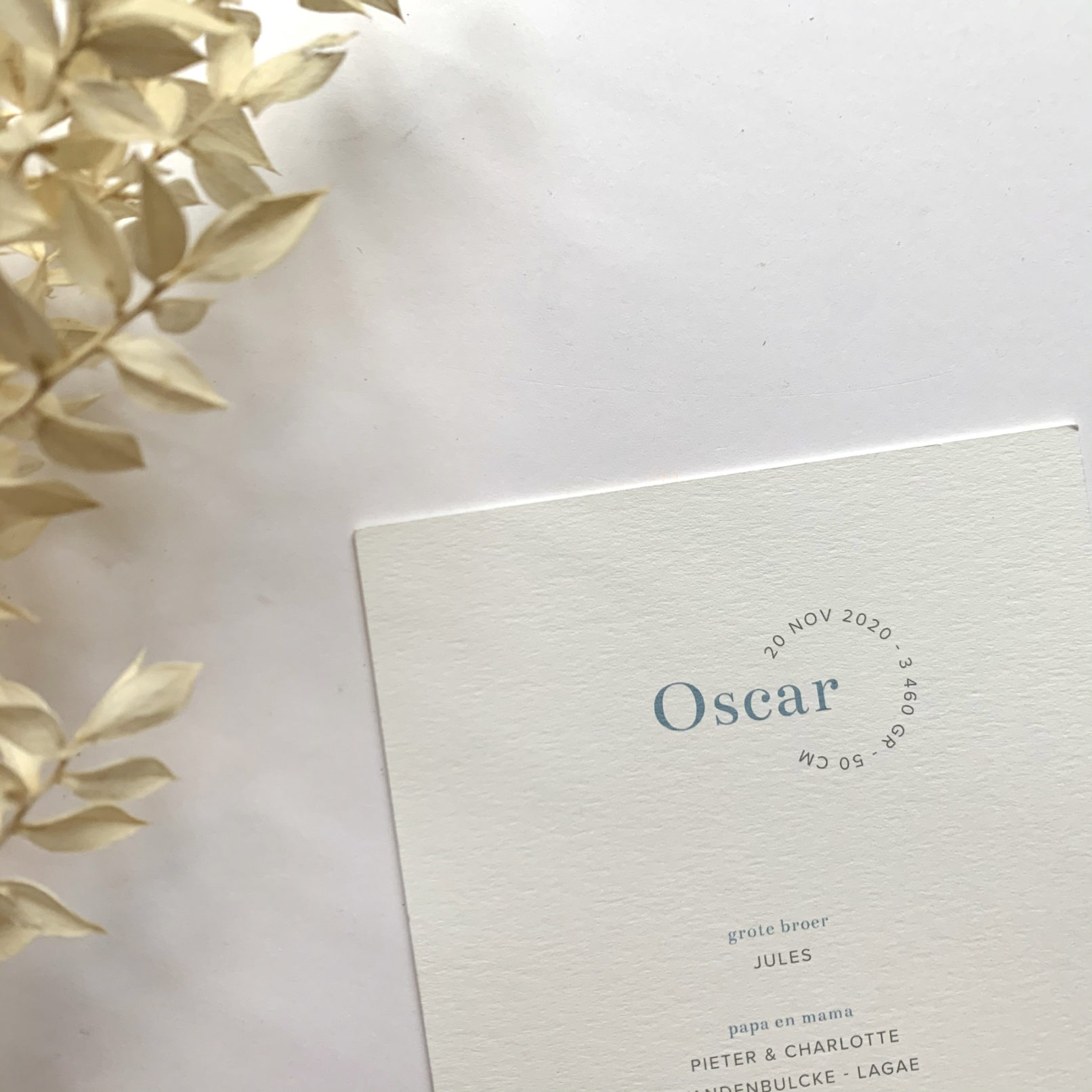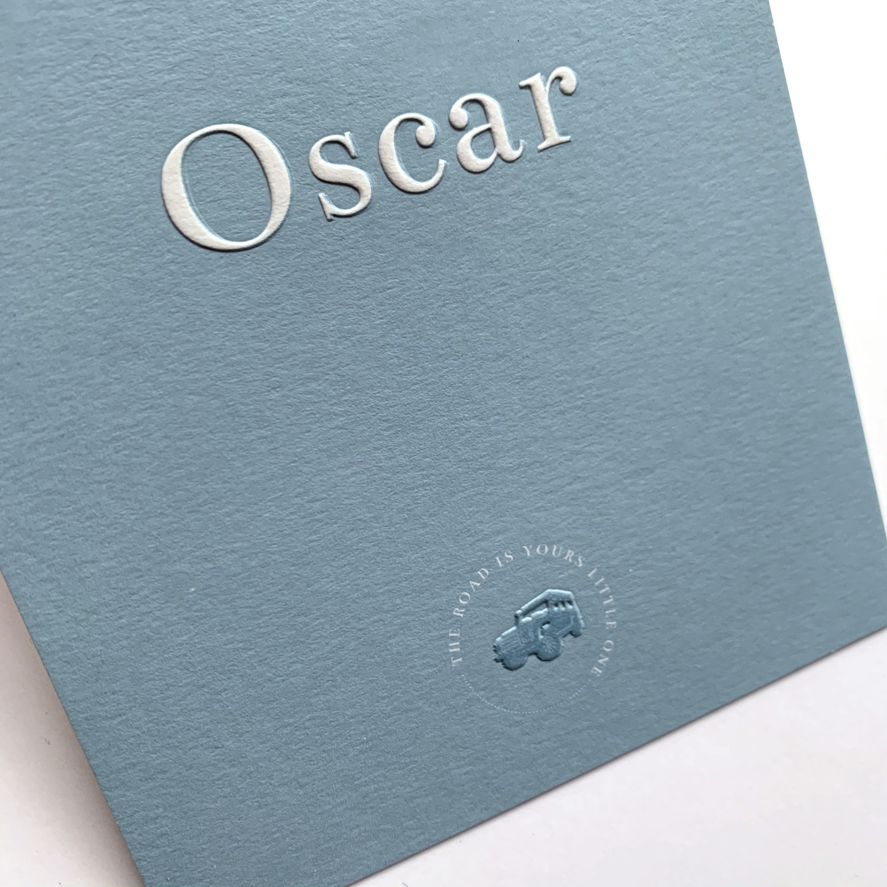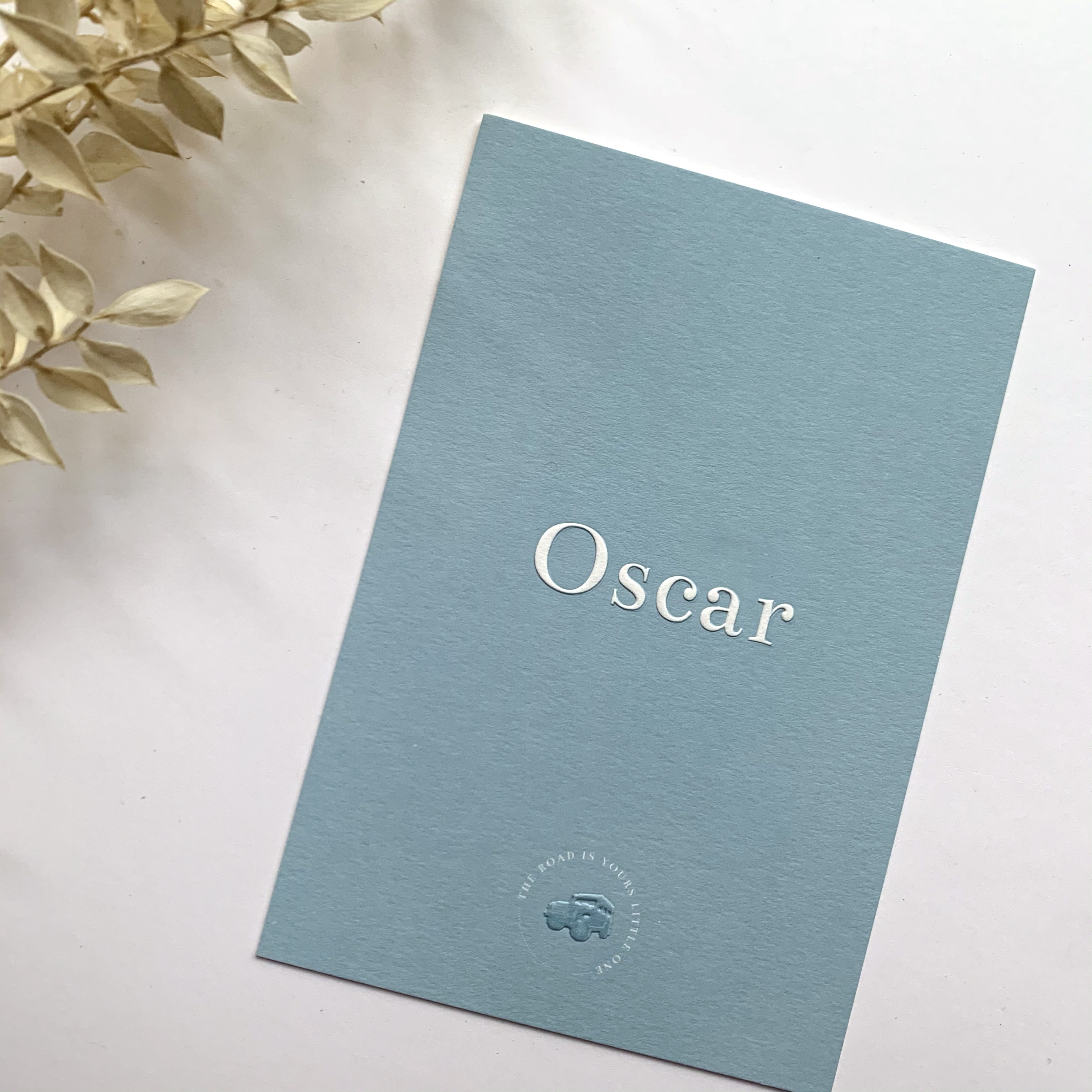 Geboortekaartje in jeansblauw voor Oscar. Blinddruk toegepast en link met de liefde van de papa voor Defenders. Doopsuikers door Petit Rêve