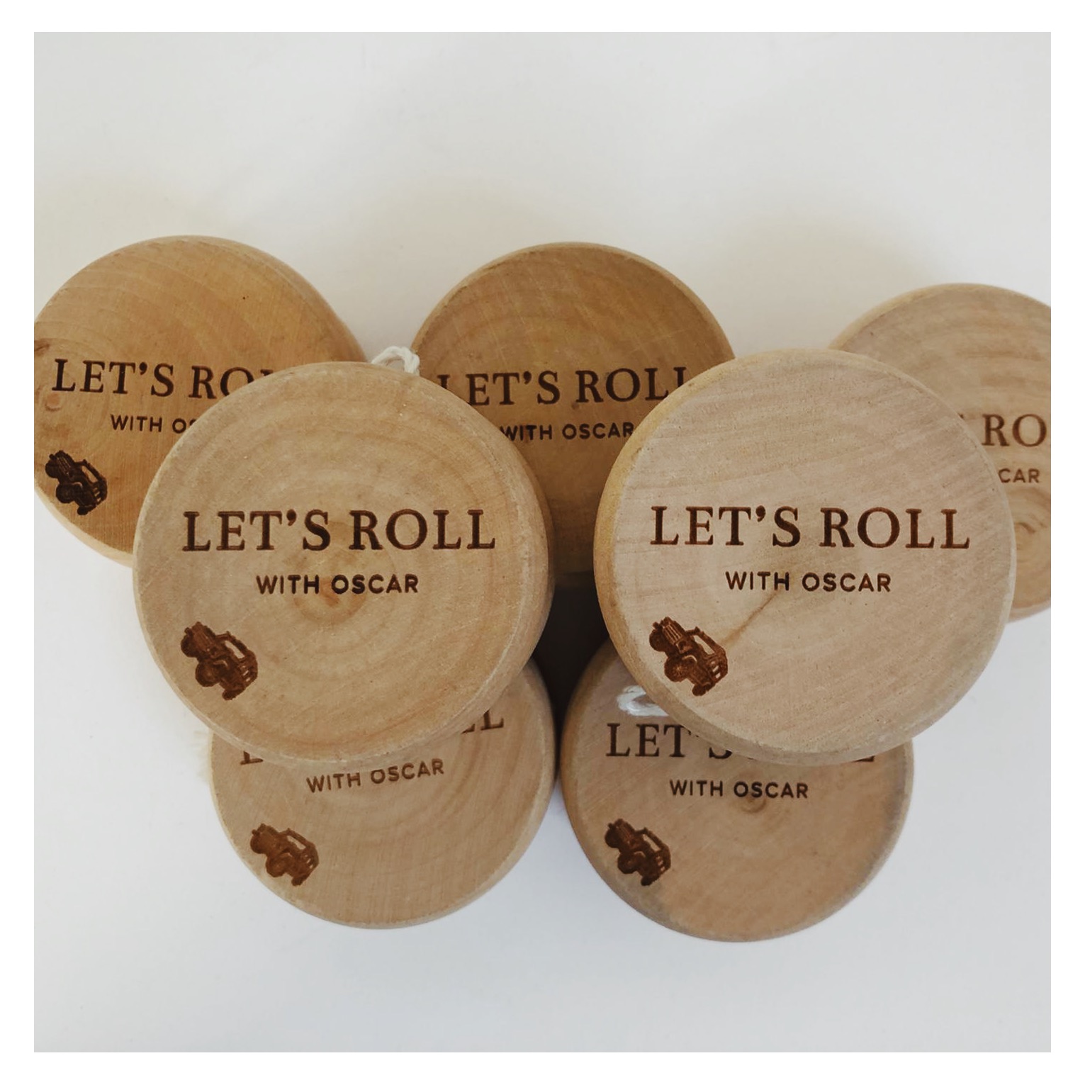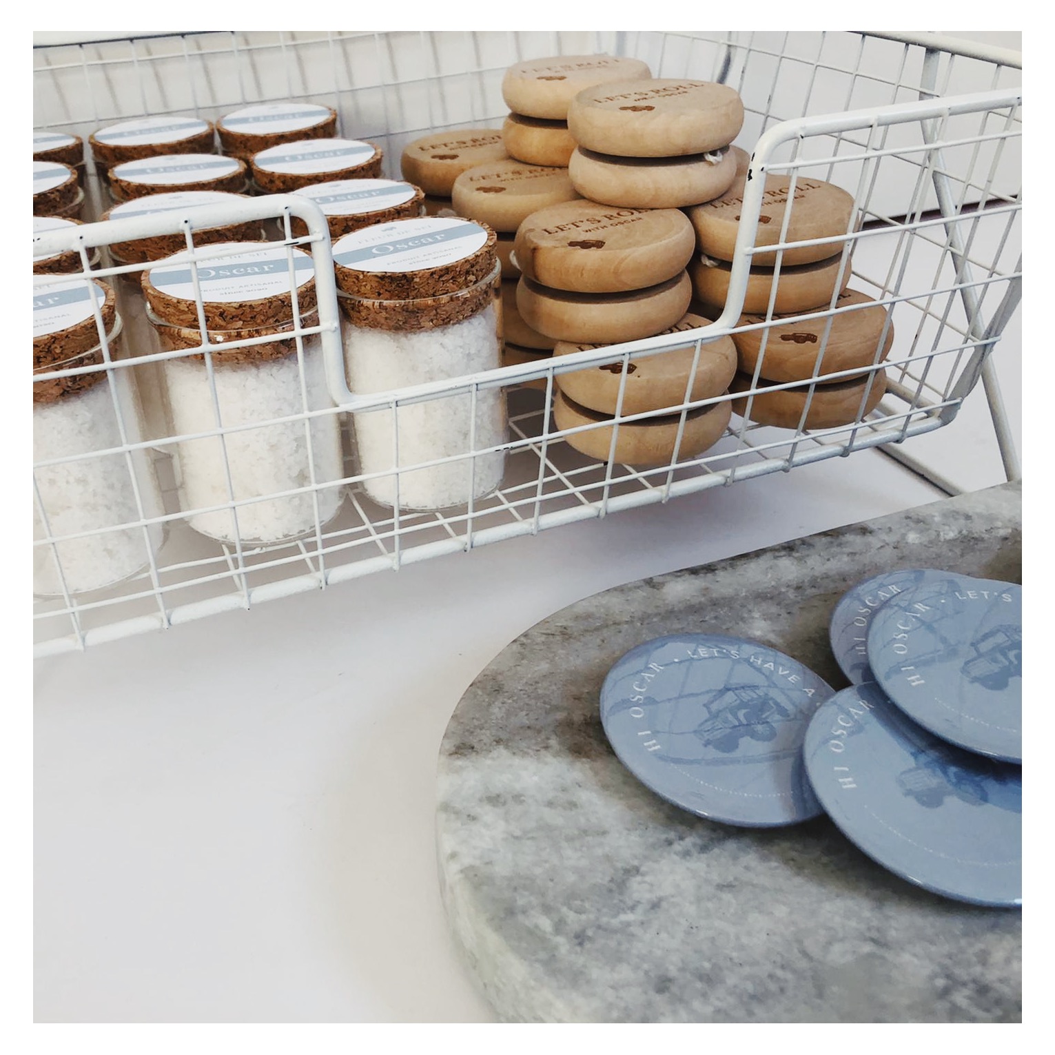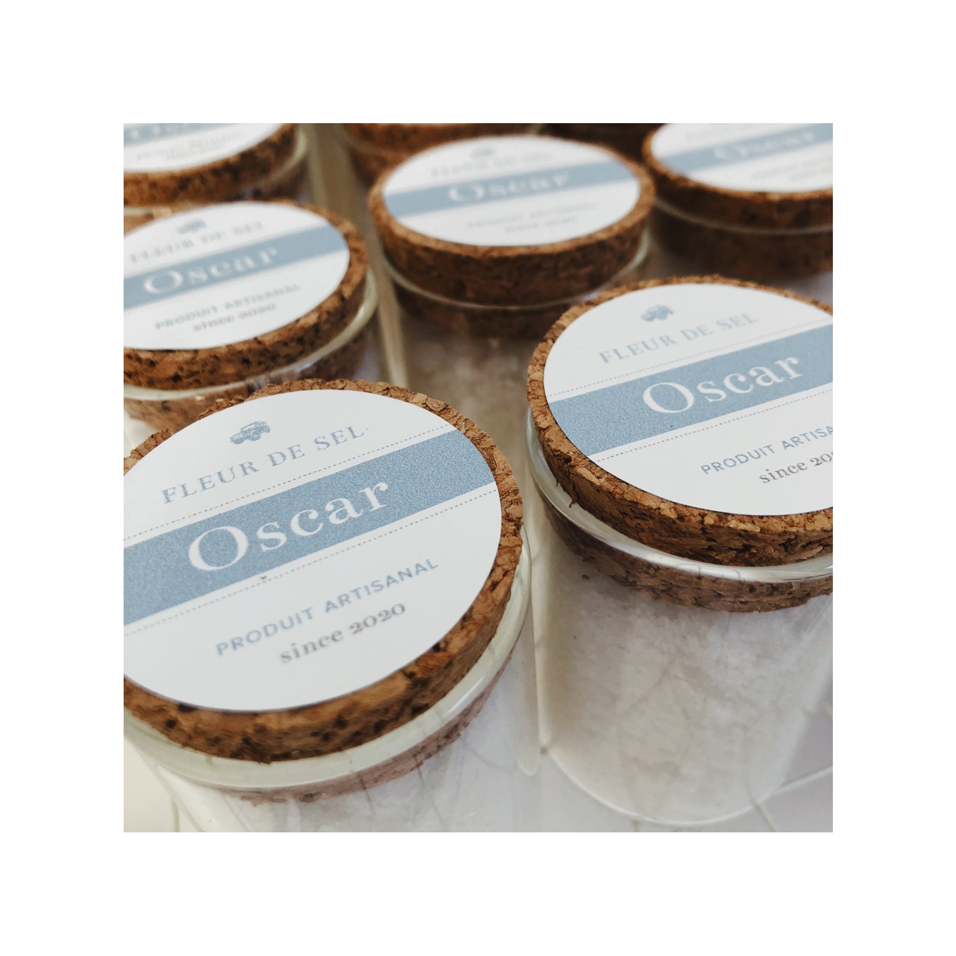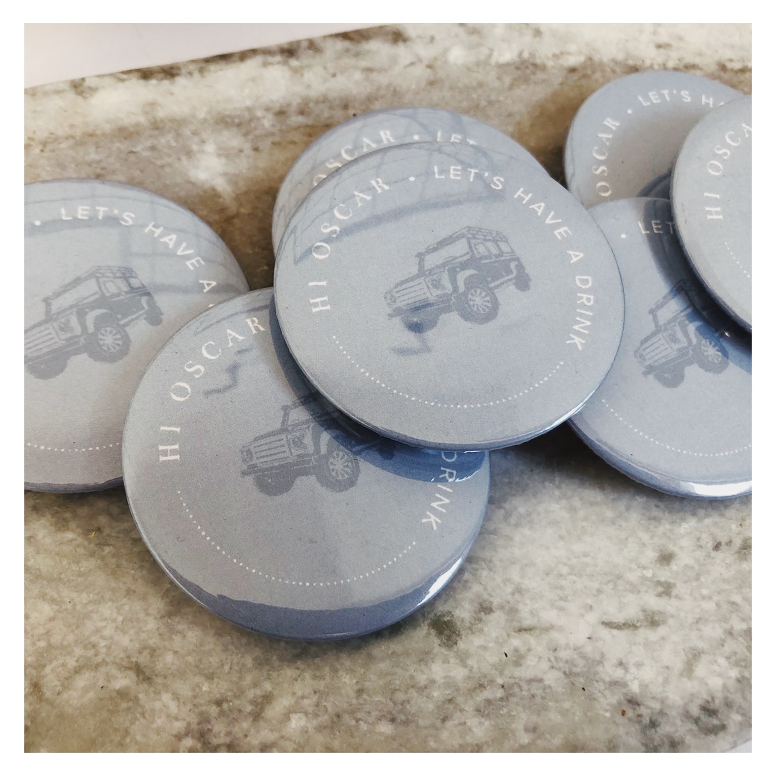 Geboortekaartje in jeansblauw voor Oscar. Blinddruk toegepast en link met de liefde van de papa voor Defenders. Doopsuikers door Petit Rêve