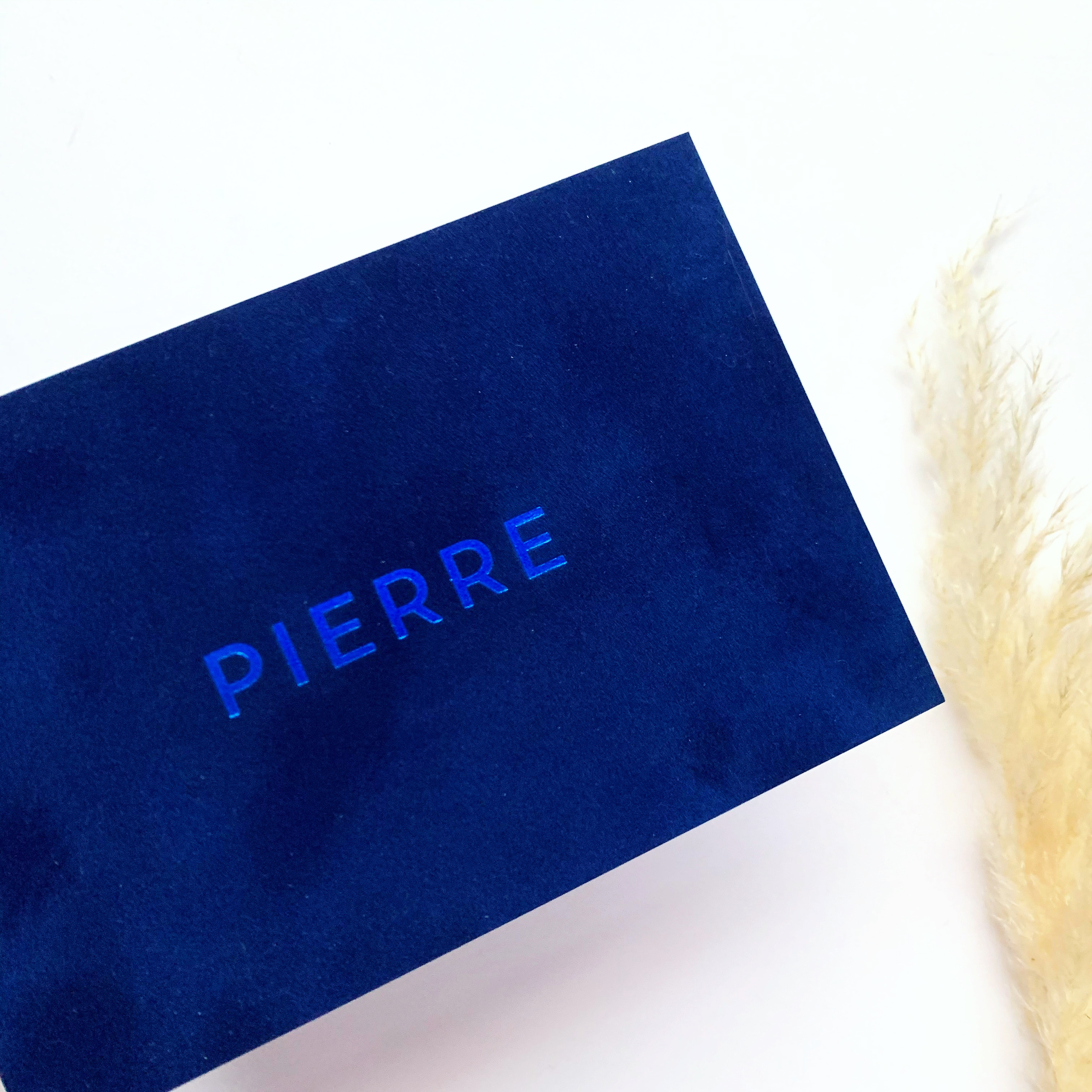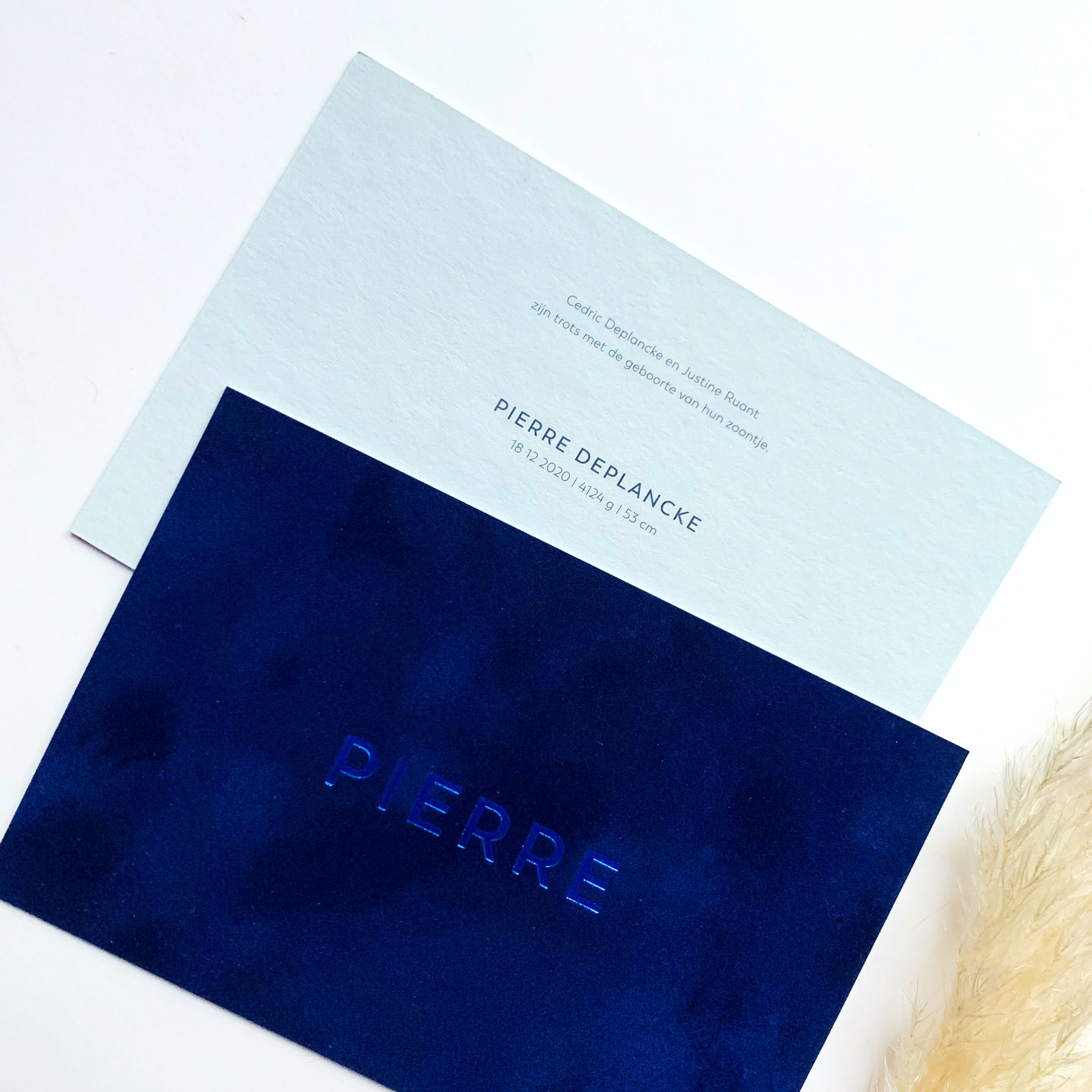Blauw velours met blauwe folie voor het geboortekaartje van Pierre