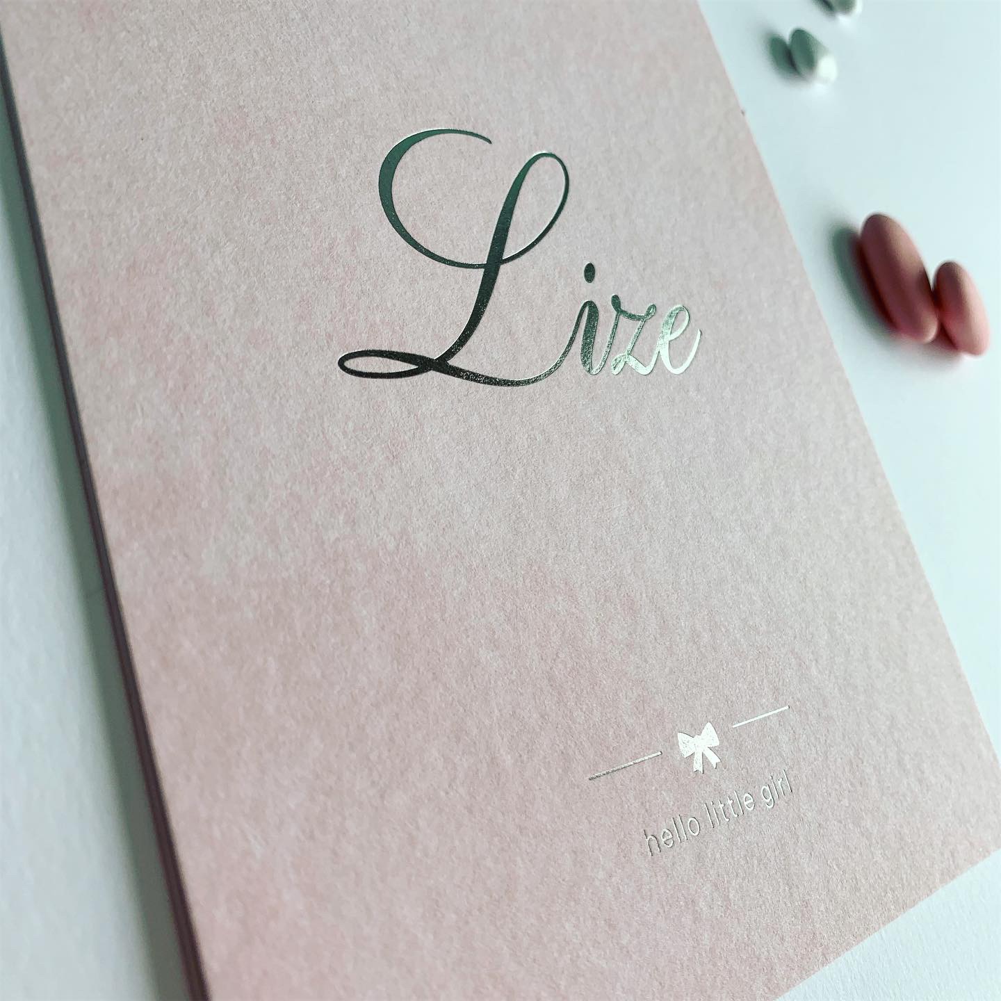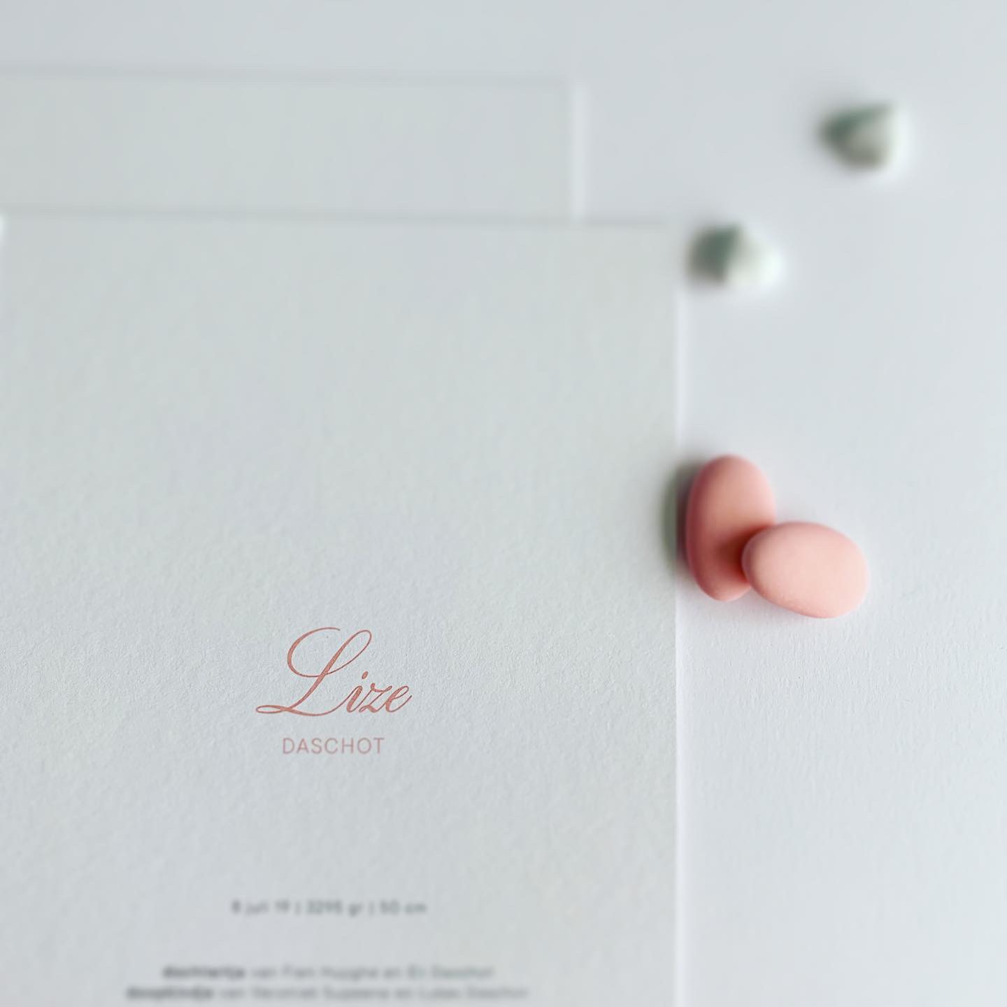 Geboortekaartje voor Lize, zachtroze structuur met zilveren foliedruk.