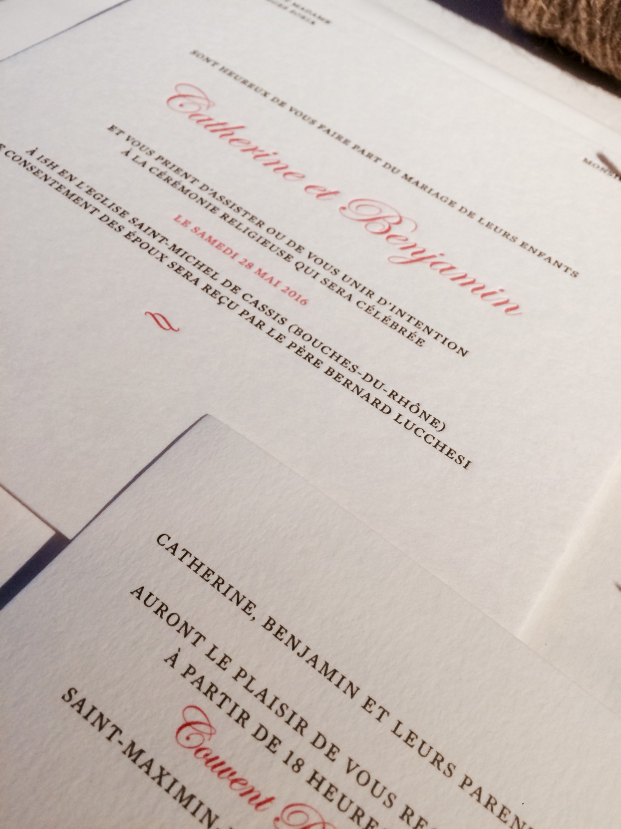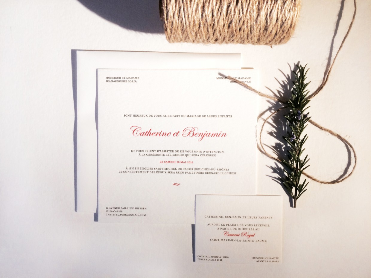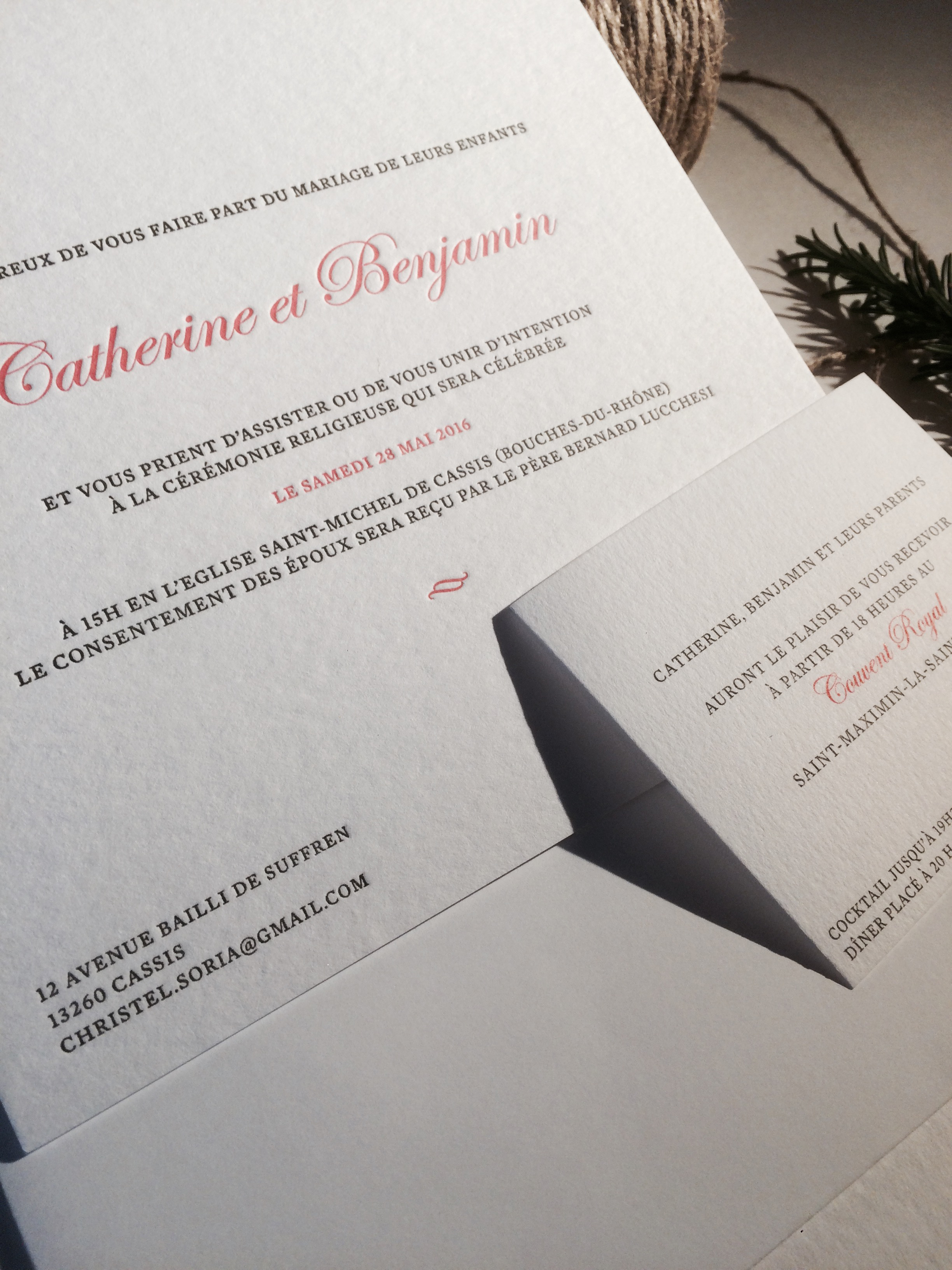 Een klassieke uitnodiging, gedrukt in twee kleuren met de letterpers, rood-koraal en warm grijs.
